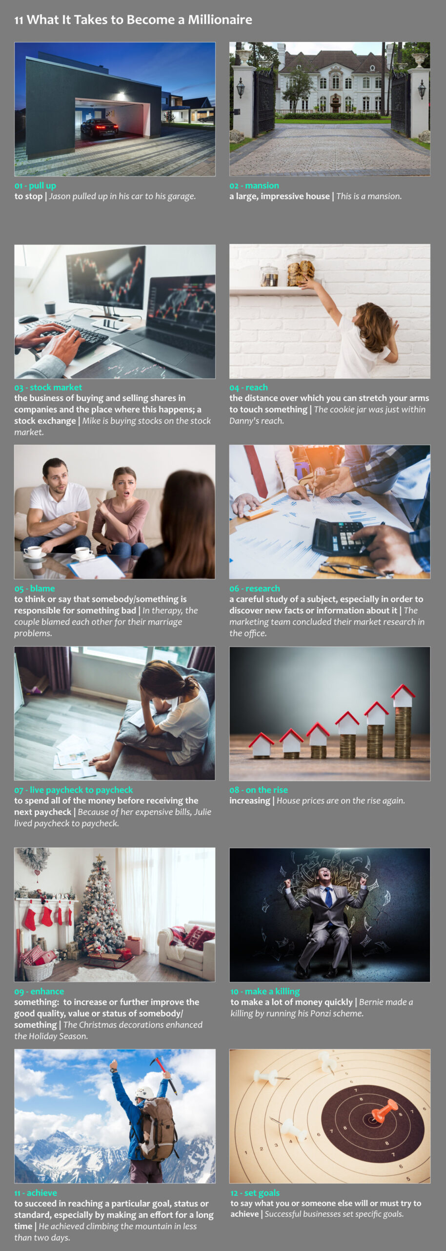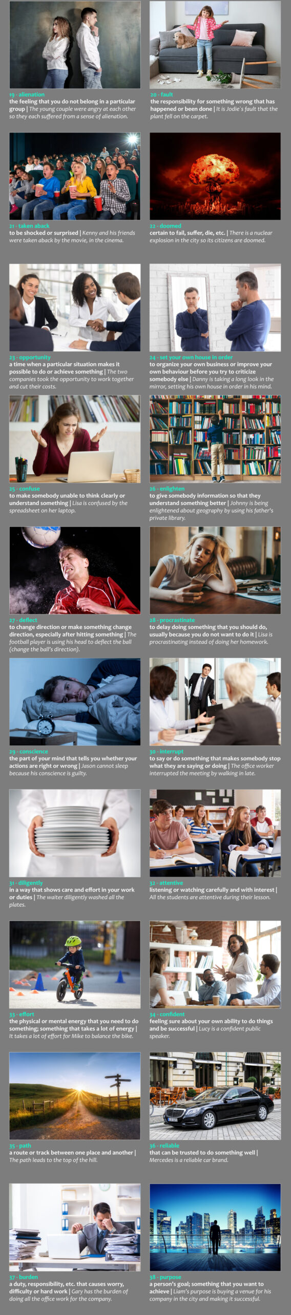 purpose38: a person’s goal; something that you want to achieve | Liam’s purpose is buying a venue for his company in the city and making it successful.