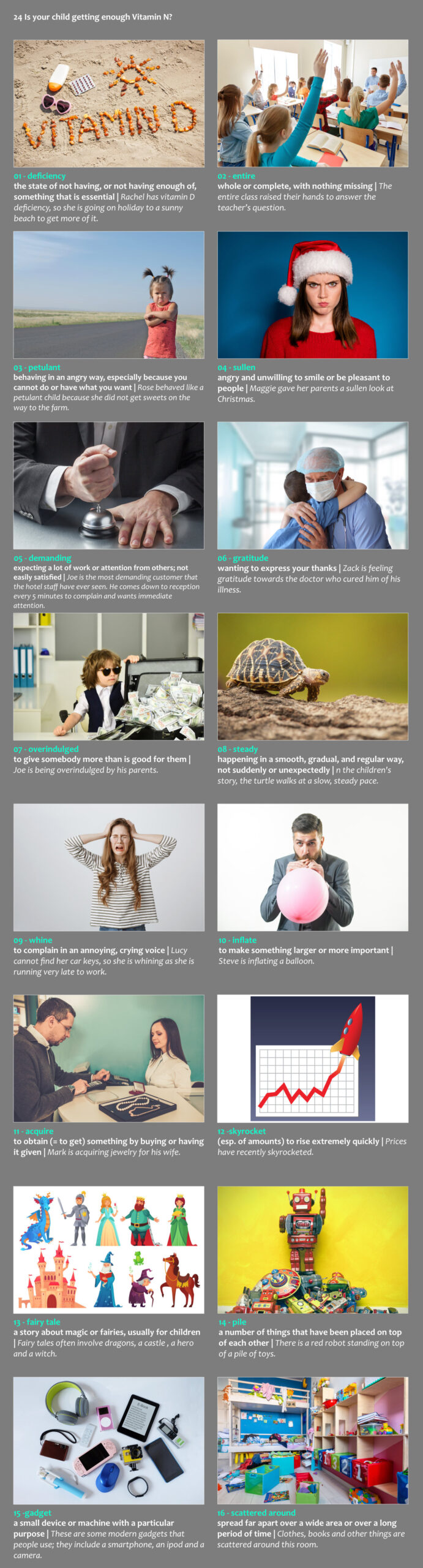 deficiency23: the lack of something that is needed in order to meet a particular standard or level of quality, or the thing that is lacking Lisa has a deficiency of Vitamin A, so she is now eating foods with ingredients that have this vitamin in them.