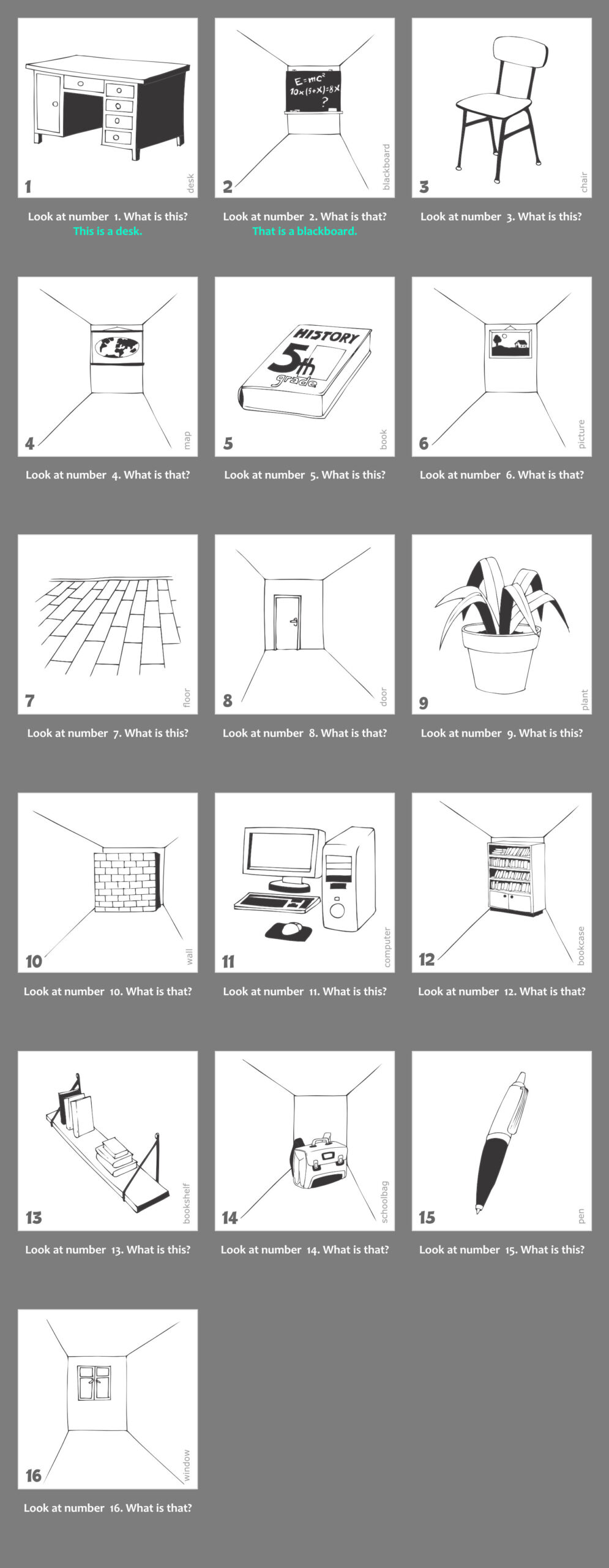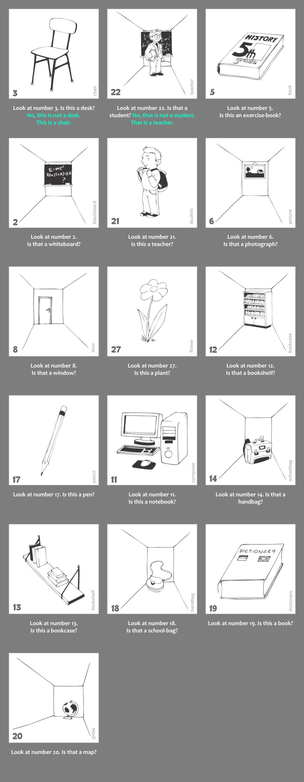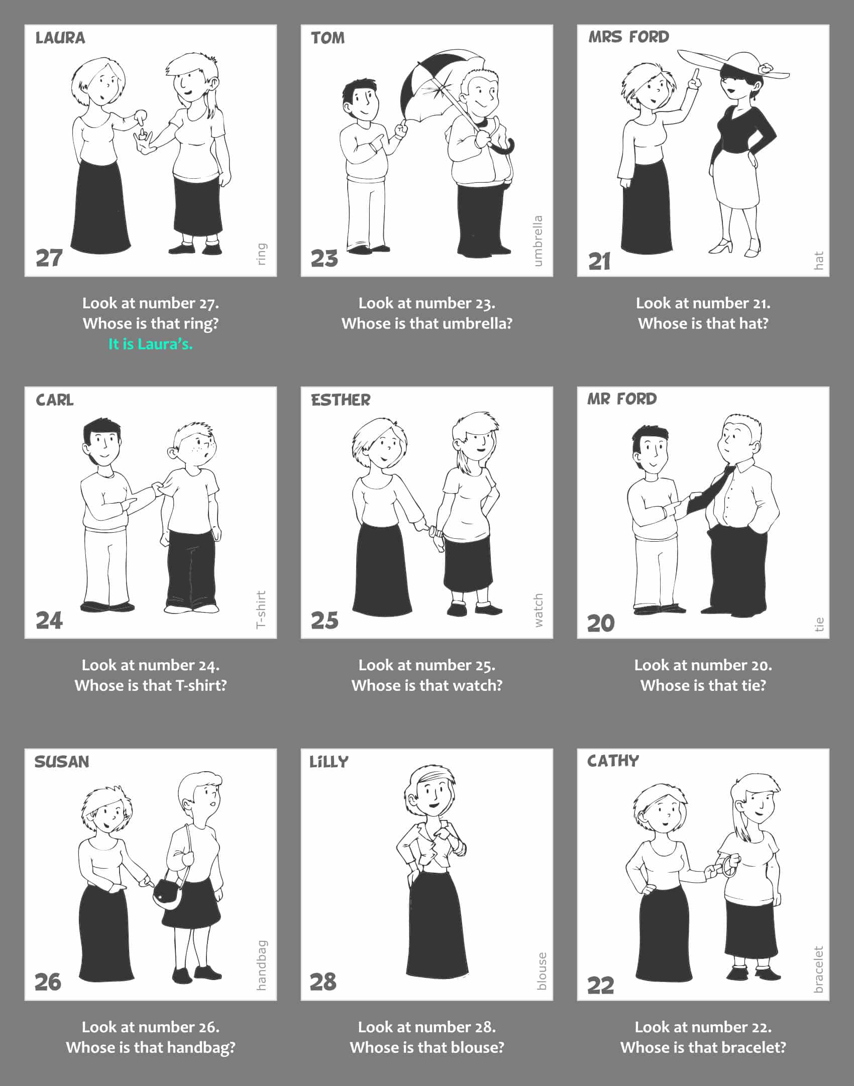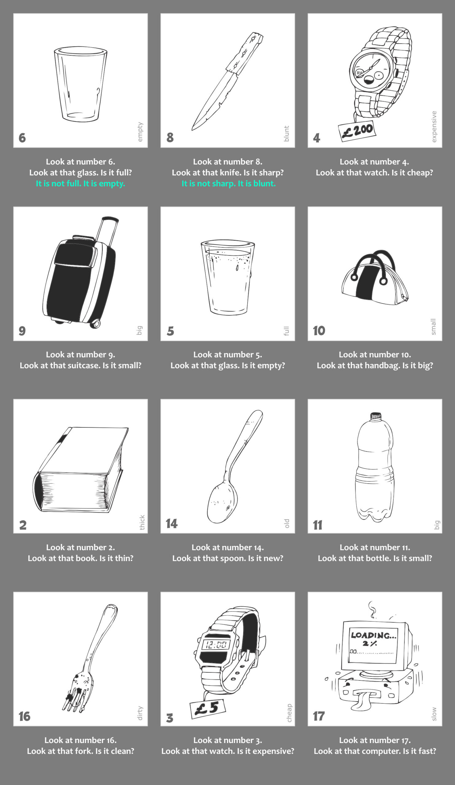1. Nyisd le a gyakorlat kapcsolóját. Látni fogod a gyakorlathoz kapcsolódó képanyagot, valamint a képek alatt a kérdéseket. Az első 2 példa válaszai mintát adnak a választípusra, amit a gyakorlat elvár. Minden képen megtalálod a kulcsszót is, így minden egyes szó leírása tisztázott.