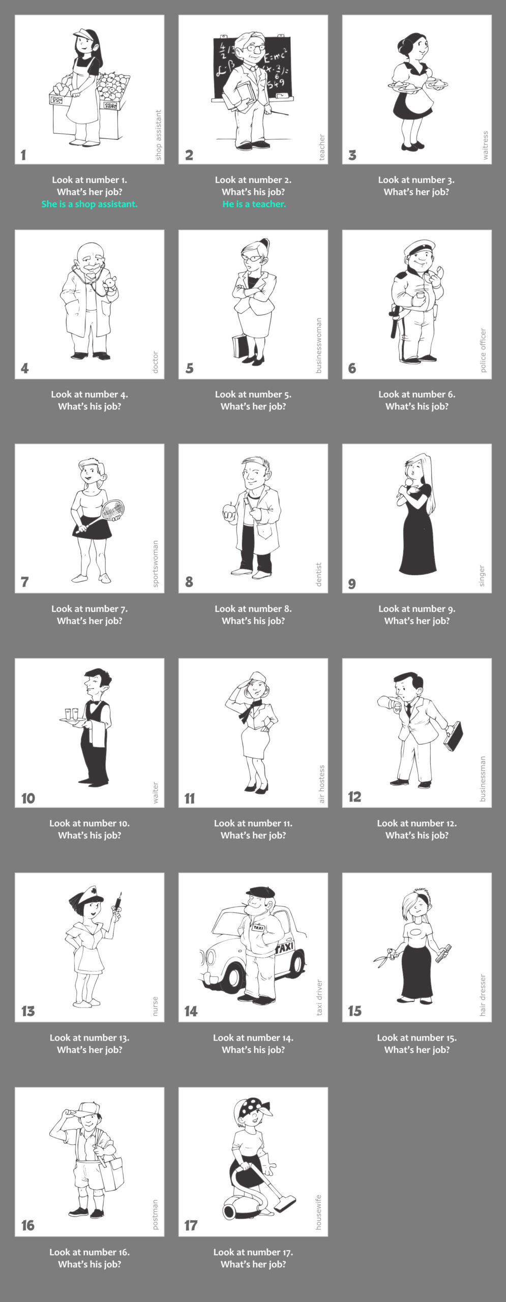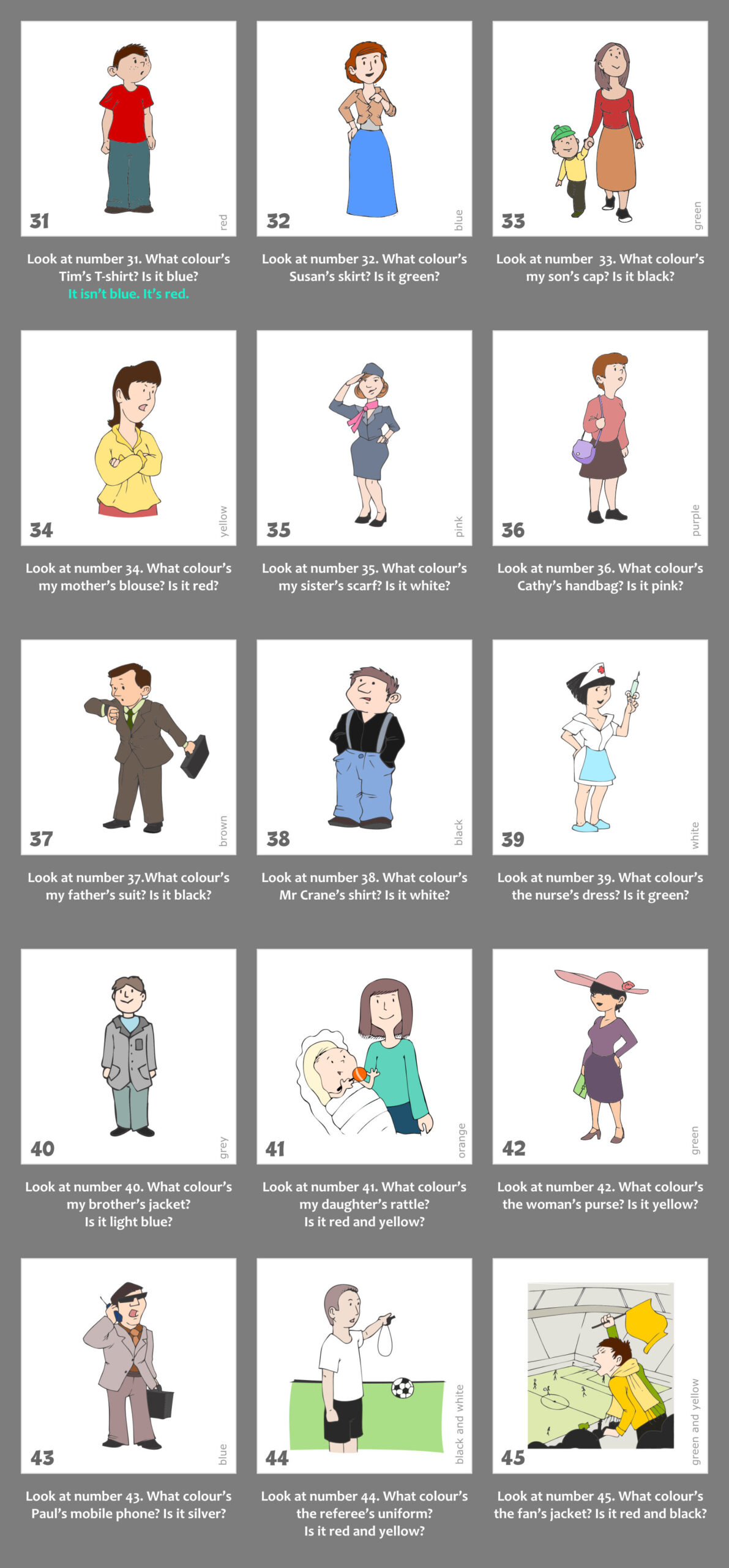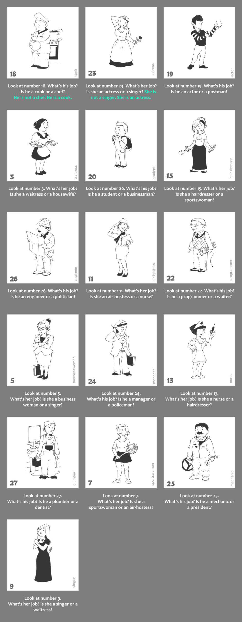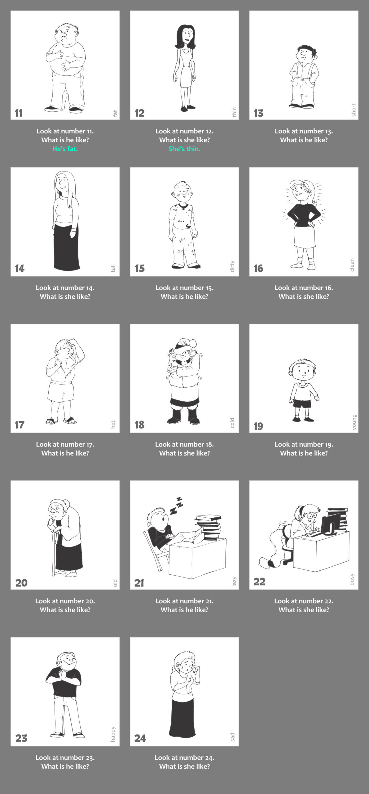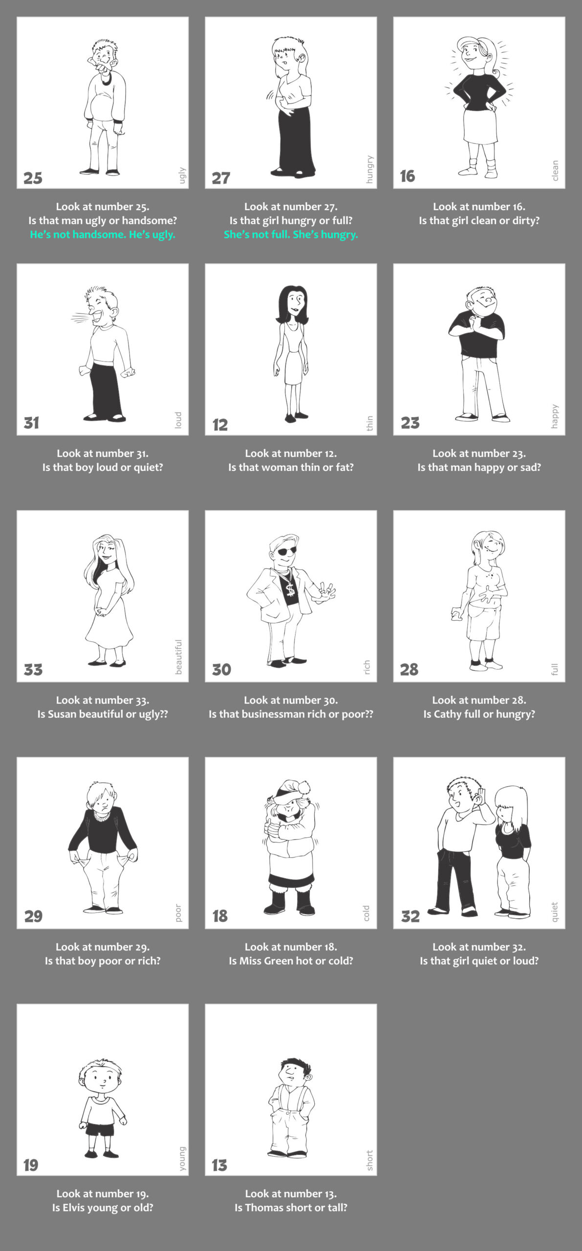 1. Nyisd le a gyakorlat kapcsolóját. Látni fogod a gyakorlathoz kapcsolódó képanyagot, valamint a képek alatt a kérdéseket. Az első 2 példa válaszai mintát adnak a választípusra, amit a gyakorlat elvár. Minden képen megtalálod a kulcsszót is, így minden egyes szó leírása tisztázott.