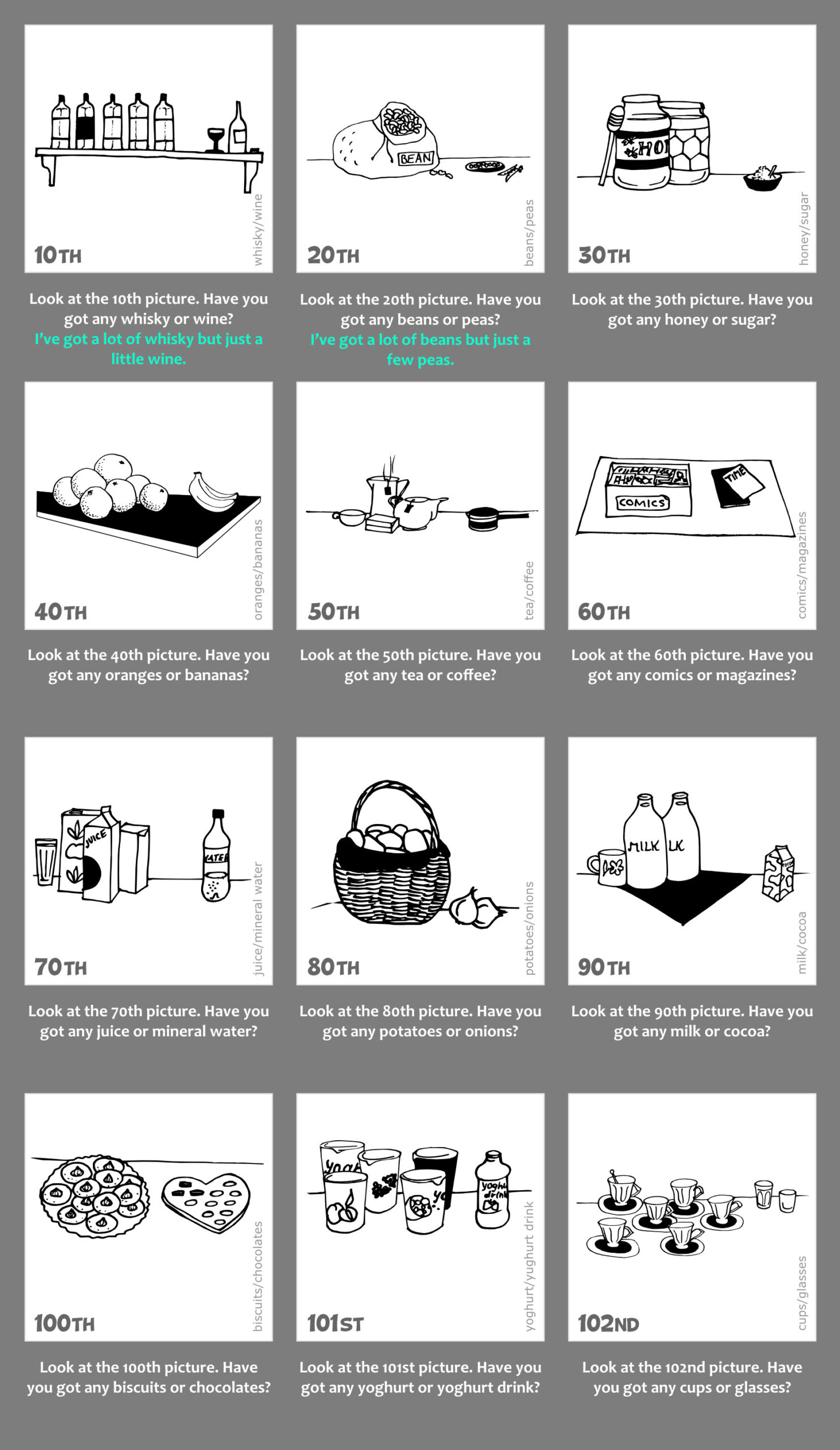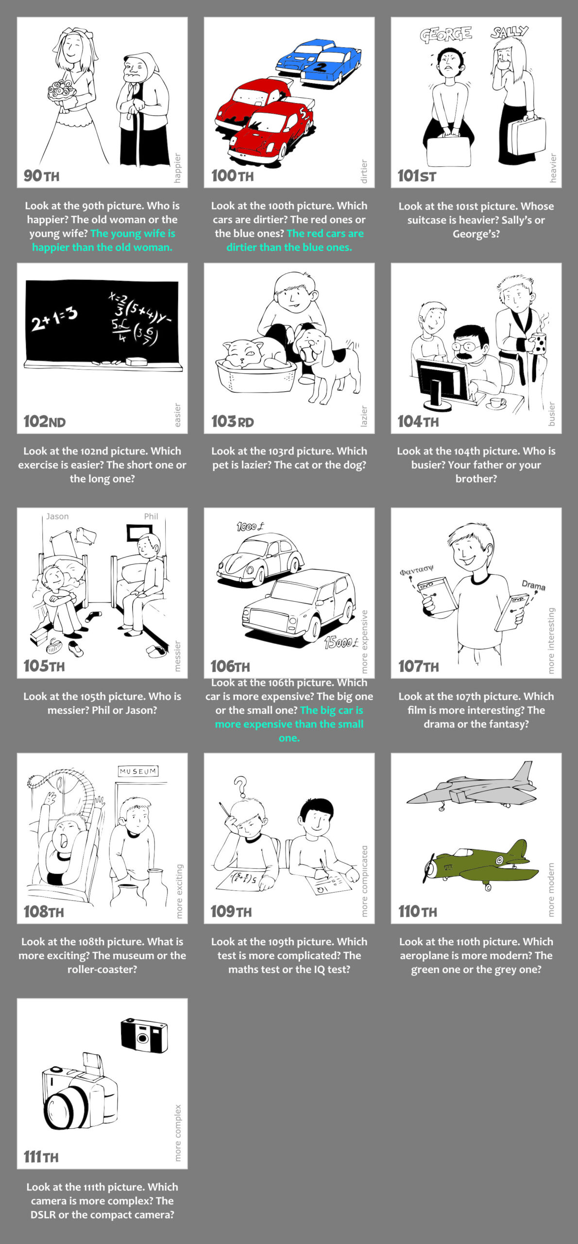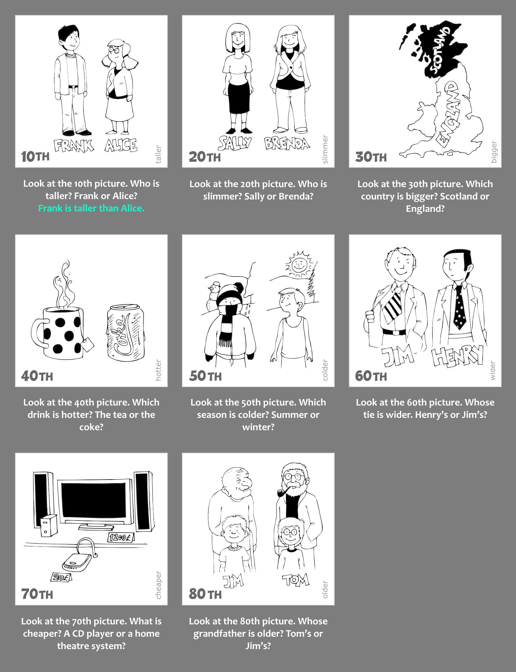 1. Nyisd le a gyakorlat kapcsolóját. Látni fogod a gyakorlathoz kapcsolódó képanyagot, valamint a képek alatt a kérdéseket. Az első 2 példa válaszai mintát adnak a választípusra, amit a gyakorlat elvár. Minden képen megtalálod a kulcsszót is, így minden egyes szó leírása tisztázott.