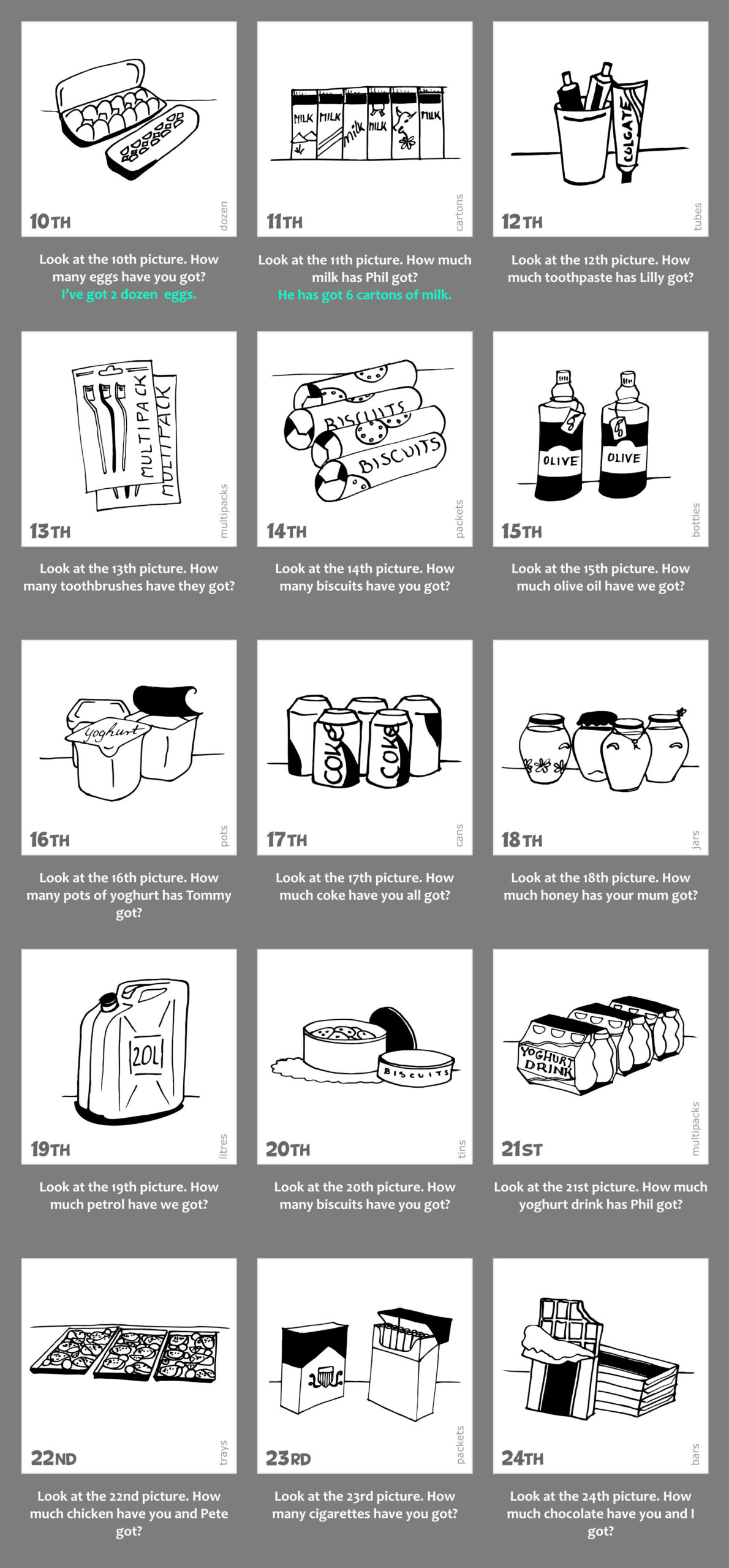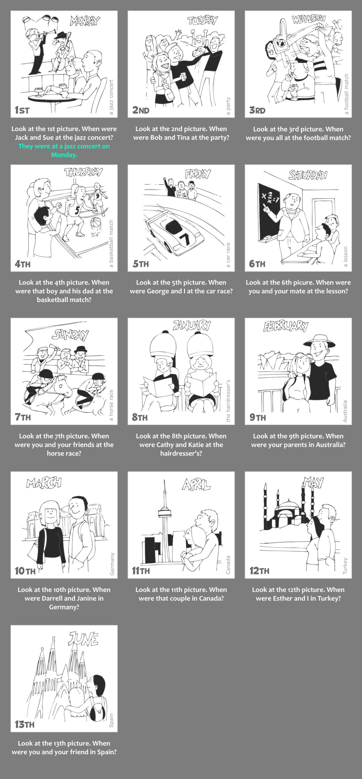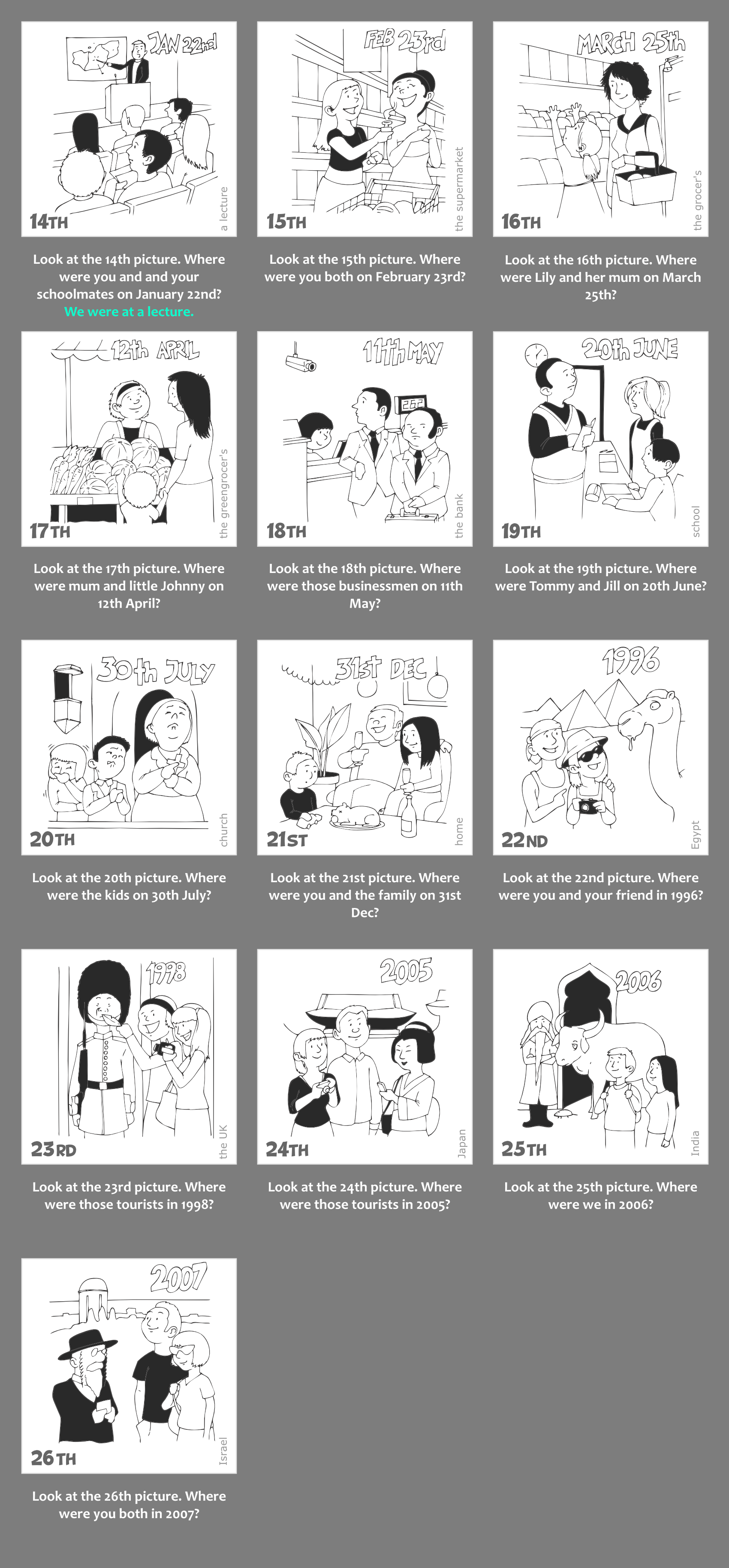 1. Nyisd le a gyakorlat kapcsolóját. Látni fogod a gyakorlathoz kapcsolódó képanyagot, valamint a képek alatt a kérdéseket. Az első 2 példa válaszai mintát adnak a választípusra, amit a gyakorlat elvár. Minden képen megtalálod a kulcsszót is, így minden egyes szó leírása tisztázott.
