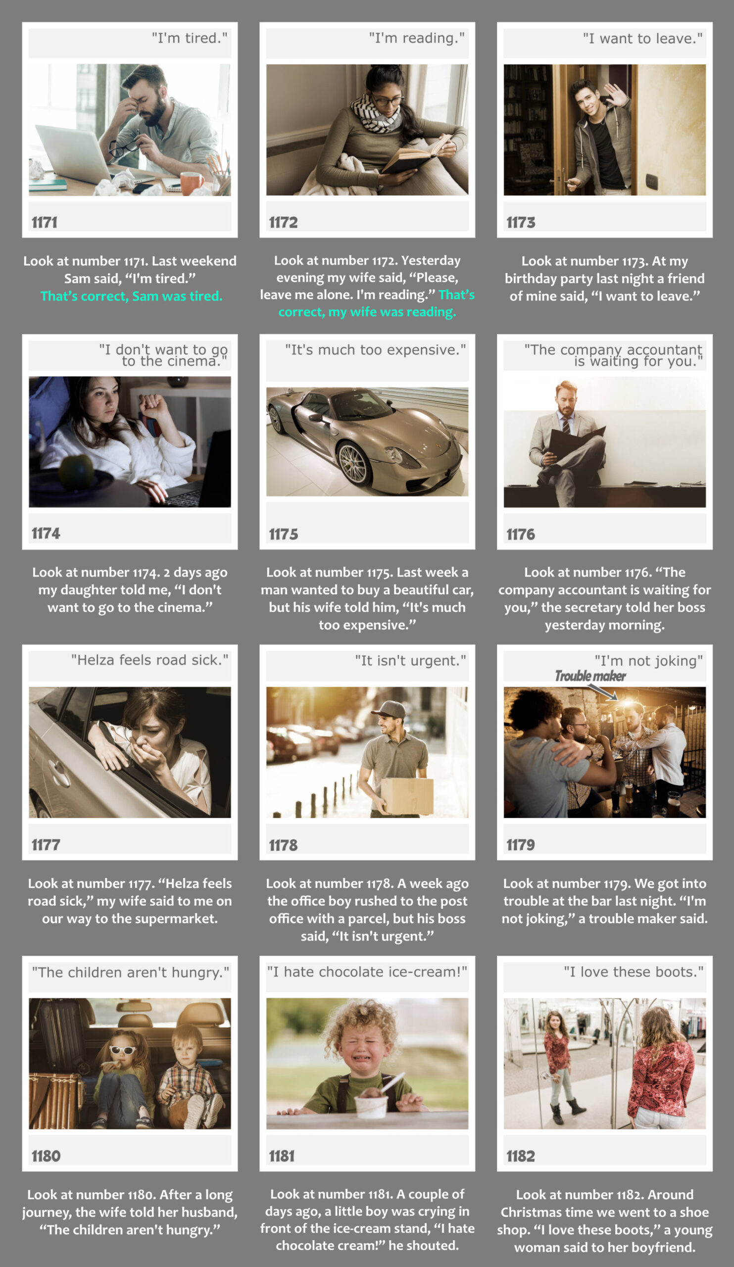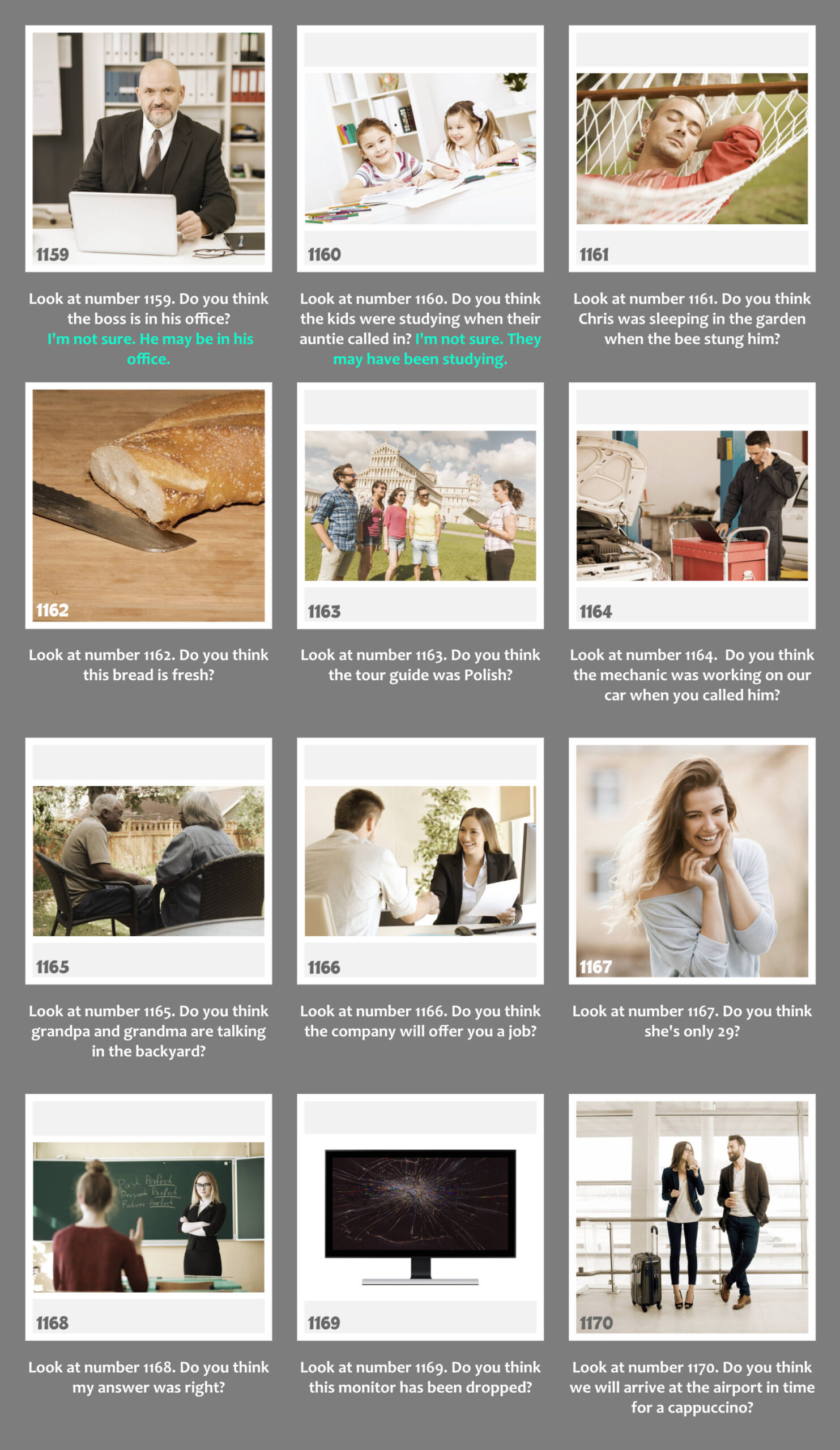 - Nyisd le a gyakorlat kapcsolóját. Látni fogod a gyakorlathoz kapcsolódó képanyagot, valamint a képek alatt a kérdéseket. Az első 2 példa válaszai mintát adnak a választípusra, amit a gyakorlat elvár. Minden képen megtalálod a kulcsszót is, így minden egyes szó leírása tisztázott.