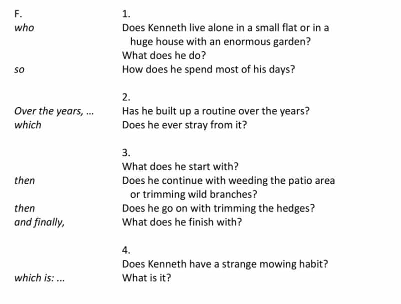 I live alone in a huge house with an enormous garden. I am retired, so I spend most of my days working around the house. Over the years I have built up a routine which I never stray from. I start with watering the flowers, then continue with weeding the patio area, then go on with trimming wild branches and finally finish with mowing the lawn.