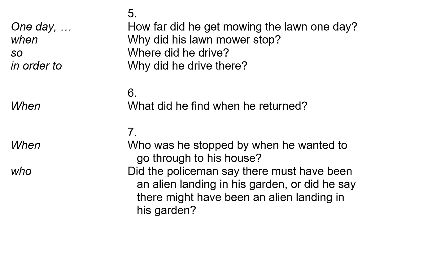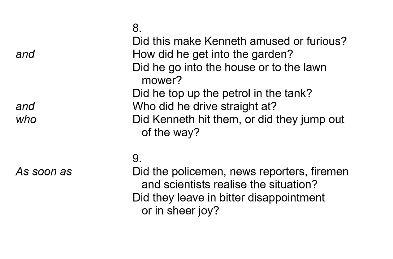 When he wanted to go through to his house, he was stopped by a policeman who said there might have been an alien landing in his garden.  This made Kenneth furious, and he jumped over the wall, went to his lawn mower, topped up the petrol in the tank and drove straight at the scientists, who jumped out of the way. As soon as the policemen, news reporters, firemen and scientists had realised the situation, they left the scene in bitter disappointment.