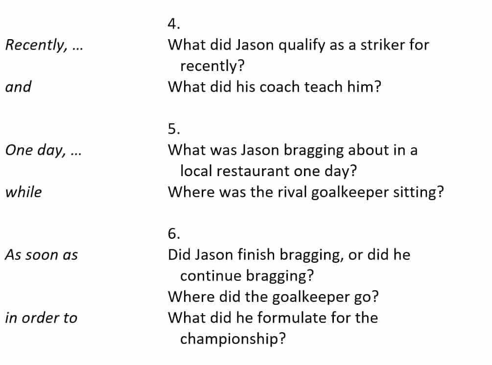 One day, Jason was bragging to his classmates in a local restaurant about his football training and told them about his new technique. Unfortunately, while he was saying this, the goalkeeper from the rival team was sitting within earshot. As soon as he had got back home, he sat down to formulate a strategy for the big day of the championship.