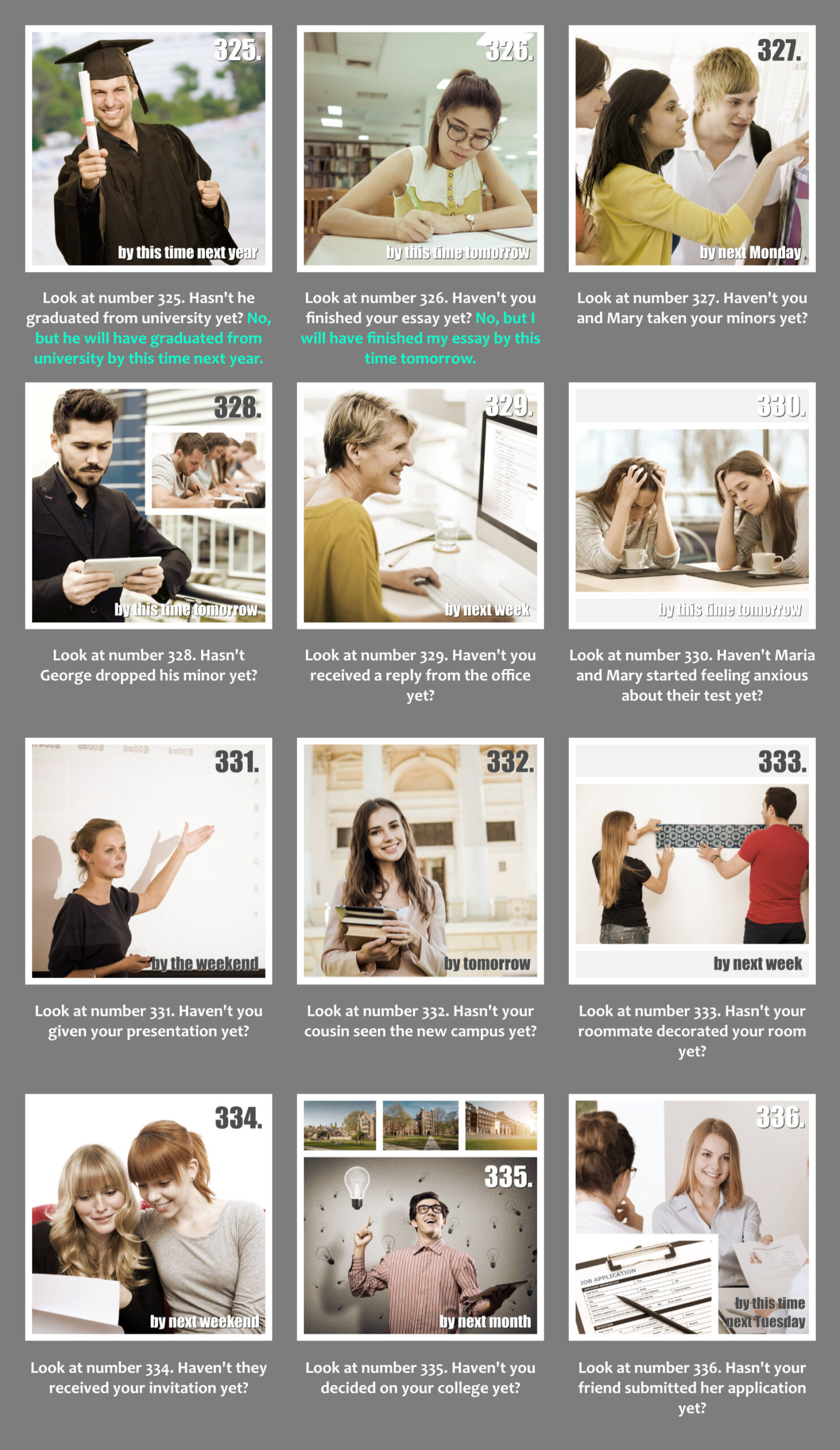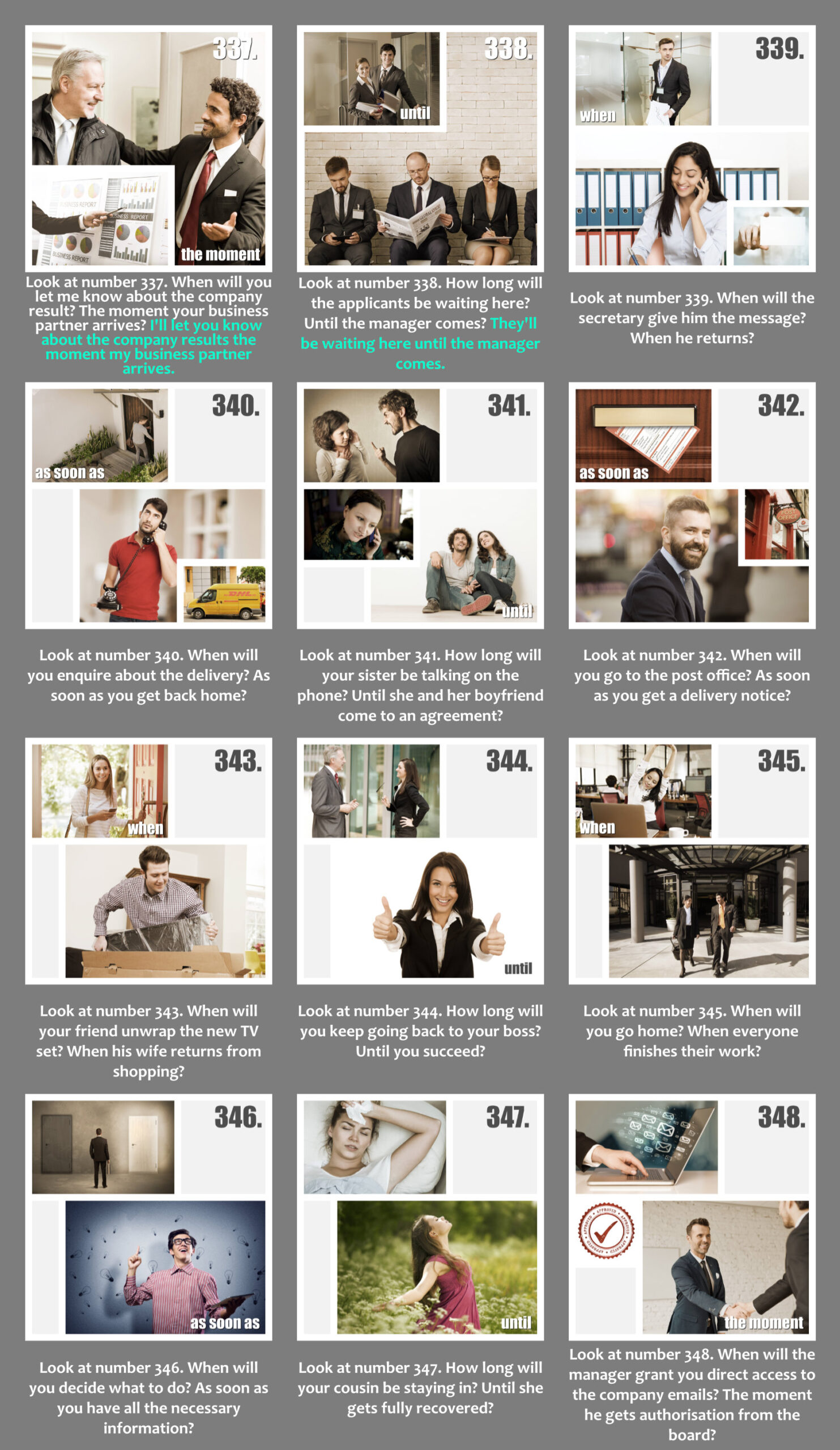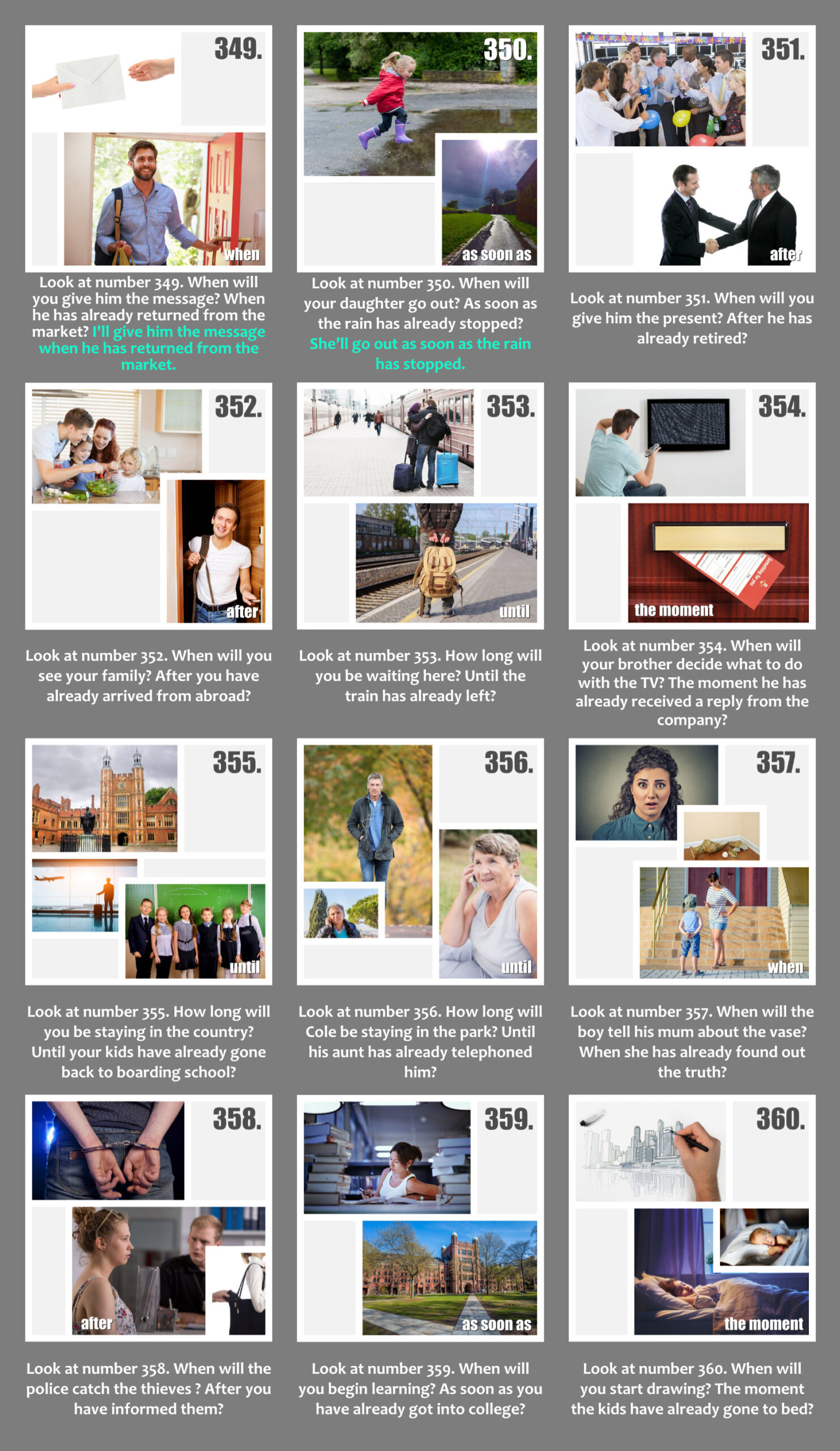 1. Nyisd le a gyakorlat kapcsolóját. Látni fogod a gyakorlathoz kapcsolódó képanyagot, valamint a képek alatt a kérdéseket. Az első 2 példa válaszai mintát adnak a választípusra, amit a gyakorlat elvár. Minden képen megtalálod a kulcsszót is, így minden egyes szó leírása tisztázott.