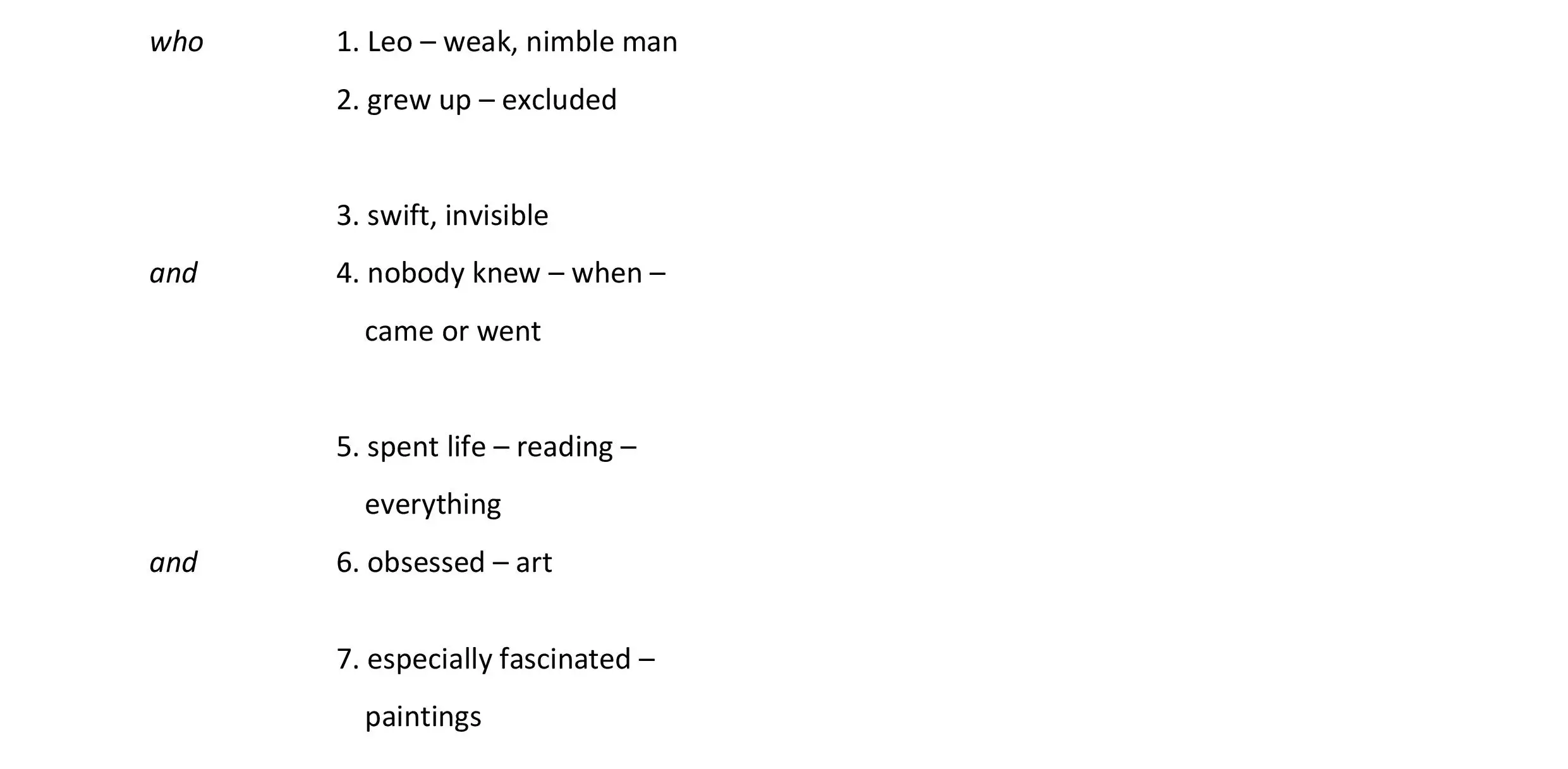 Leo is a weak, nimble man who grew up being excluded. However, he was swift and invisible, and nobody knew when he came or went. As he spent his life reading about everything, he was obsessed with art, especially with paintings.
