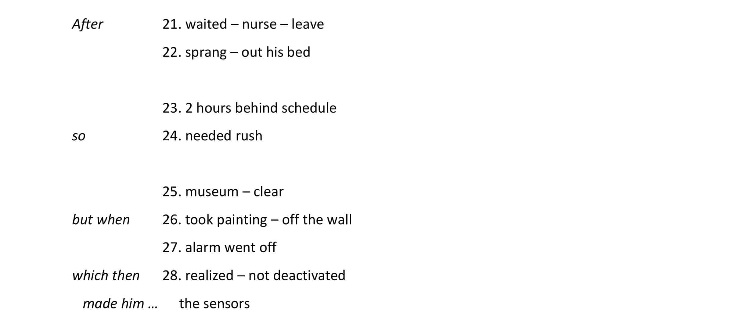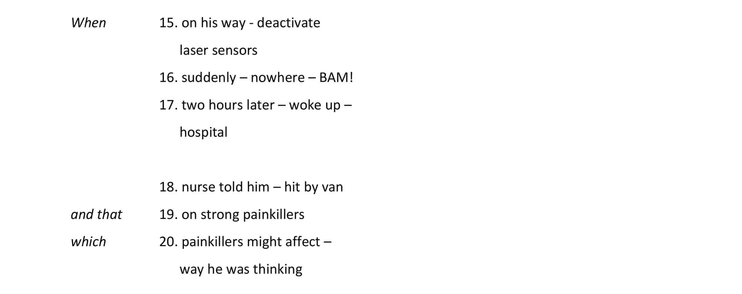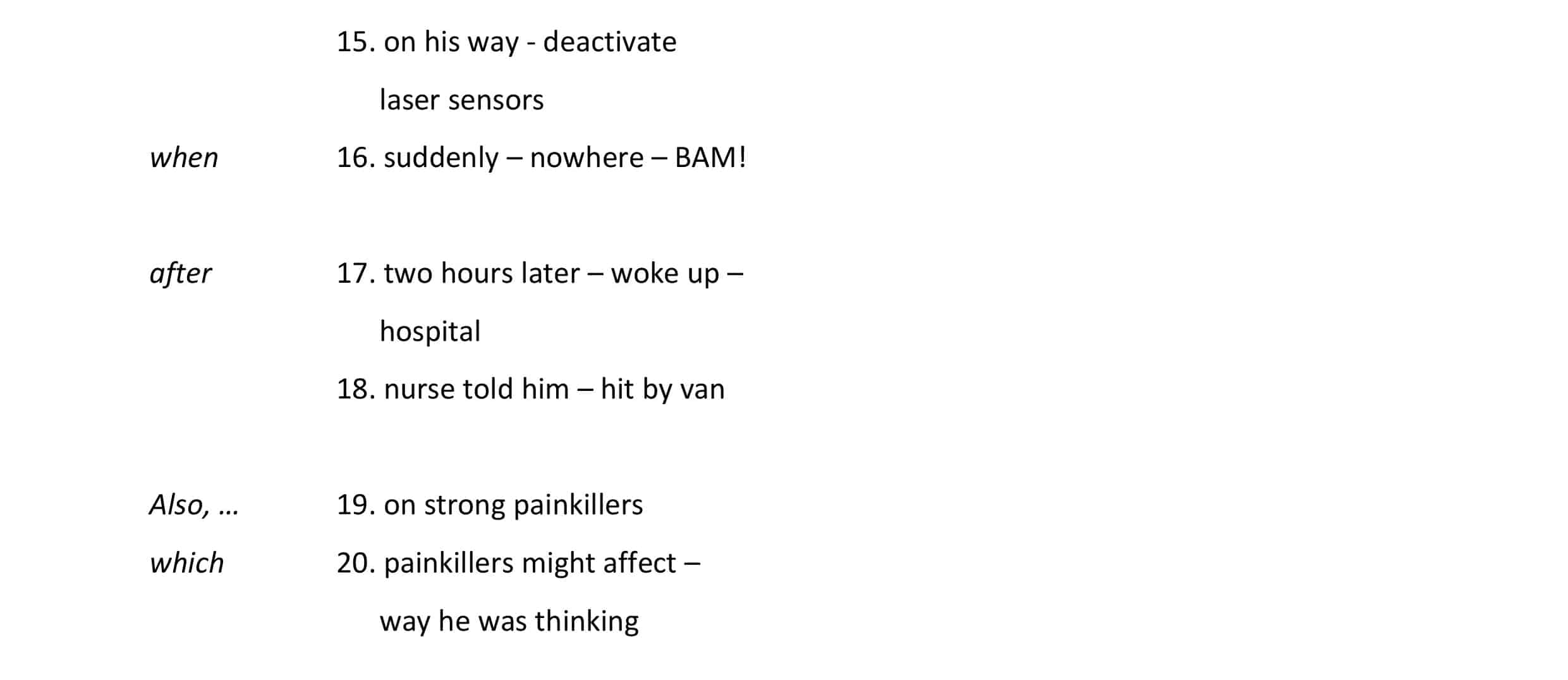 Two hours later, after Leo had woken up in the hospital, a nurse told him that he had been hit by a van. Also, he was on strong painkillers which might affect the way he was thinking. After the nurse had left, he sprang out of his bed. He was 2 hours behind his schedule, so he needed to rush.