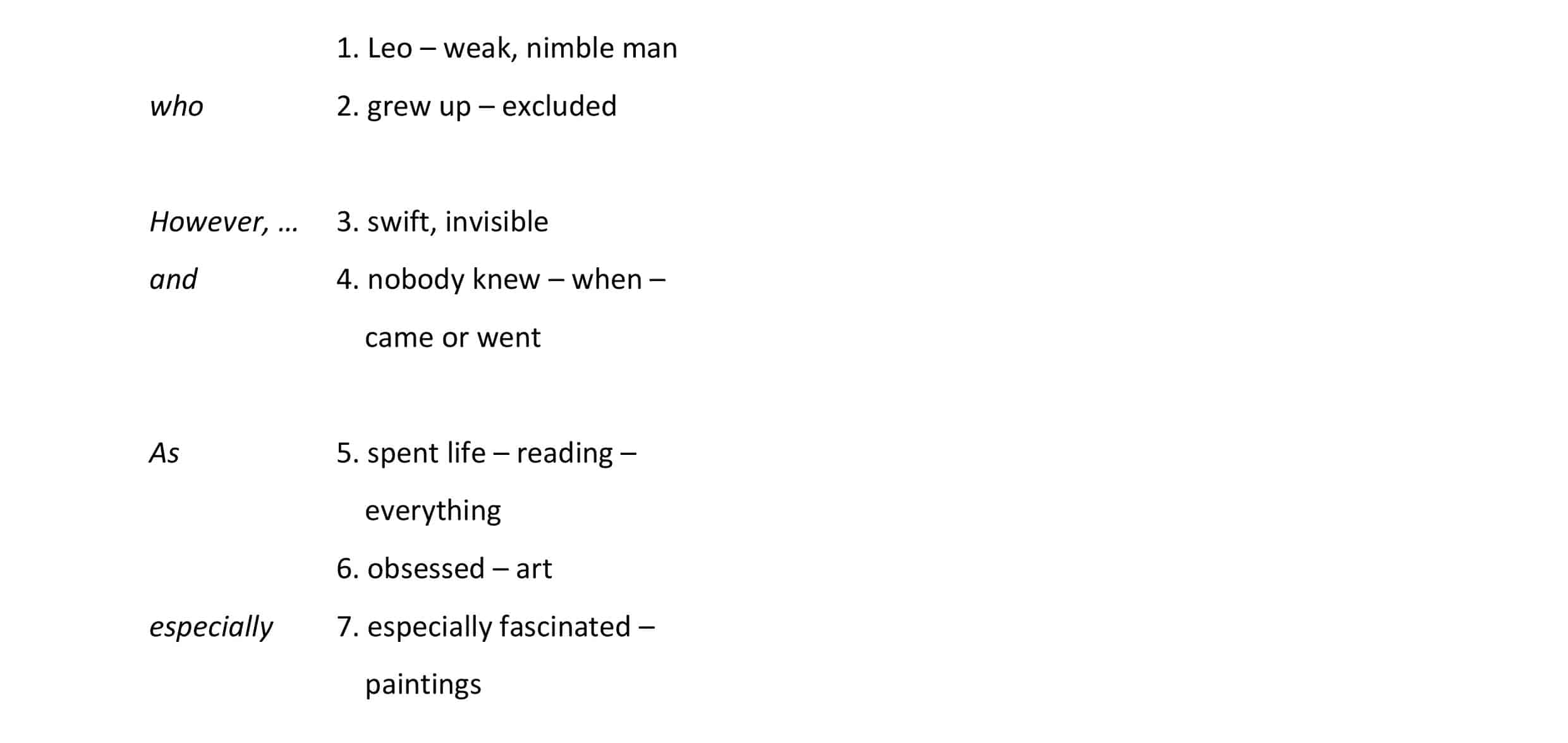 Leo is a weak, nimble man who grew up being excluded. Nobody knew when he came or went; he was swift. Invisible.