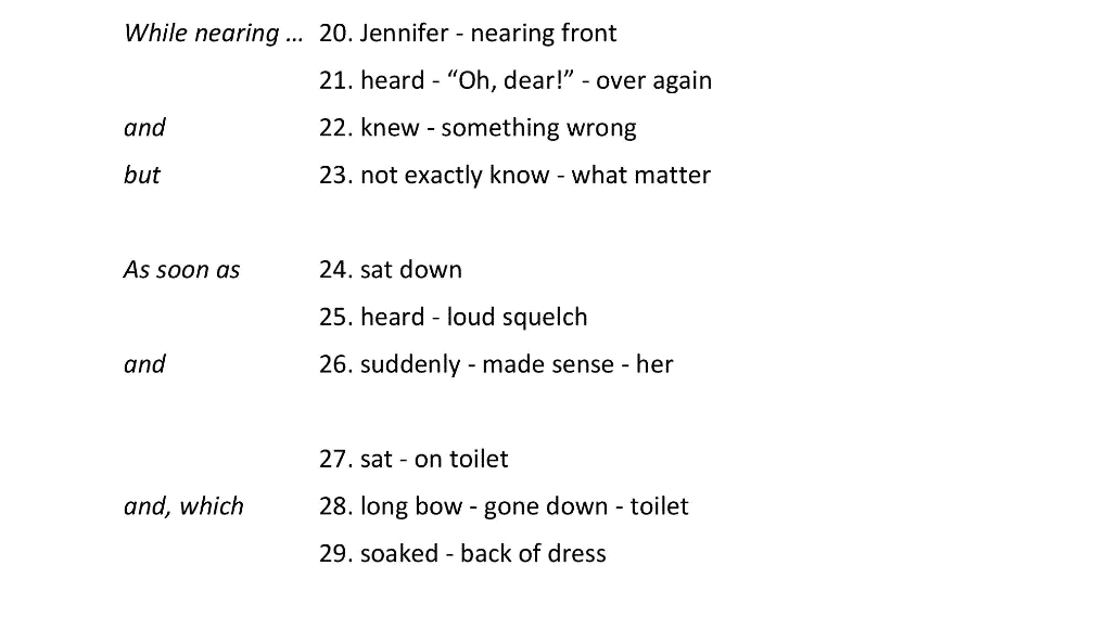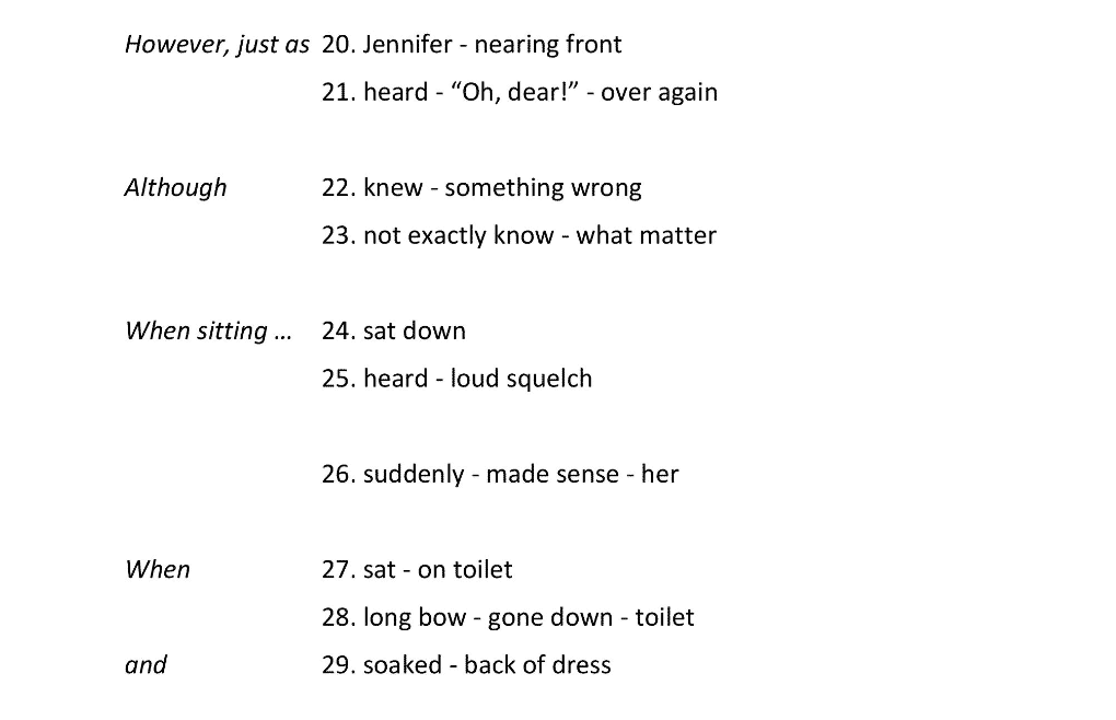 When sitting down, she heard a loud squelch. It suddenly made sense to her. When she sat on the toilet, her long bow went down the toilet and soaked the back of her dress.