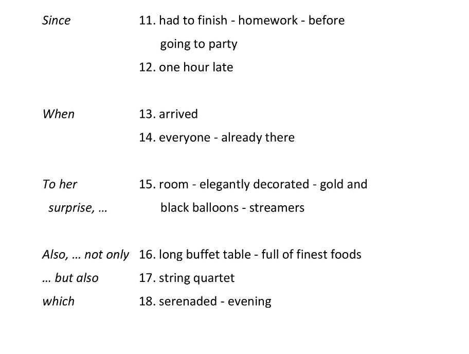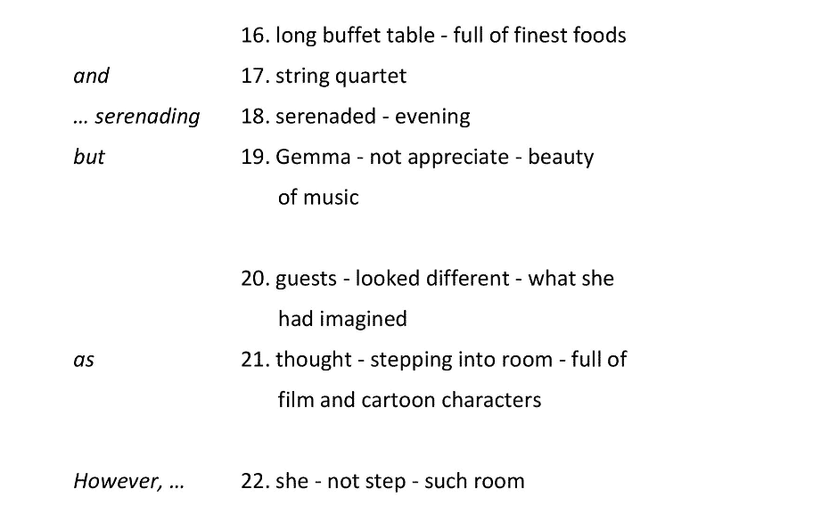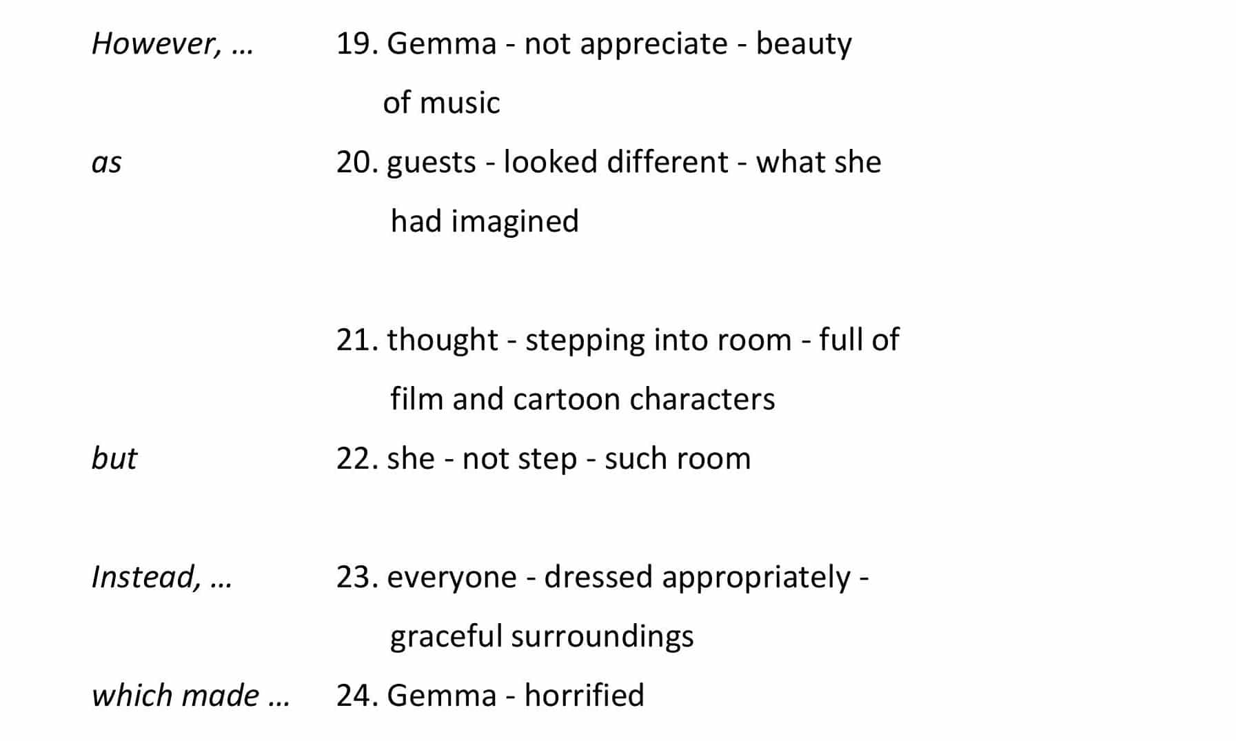 When she arrived, everyone was already there. To her surprise, the room was elegantly decorated with gold and black balloons and streamers. Also, there was not only a long buffet table full of the finest foods but also a string quartet, which serenaded the evening. However, Gemma could not appreciate the beauty of the music as the guests looked different from what she had imagined. She thought she would be stepping into a room full of film and cartoon characters, but she did not step into such a room. Instead, everyone was dressed appropriately for the graceful surroundings which made Gemma horrified.