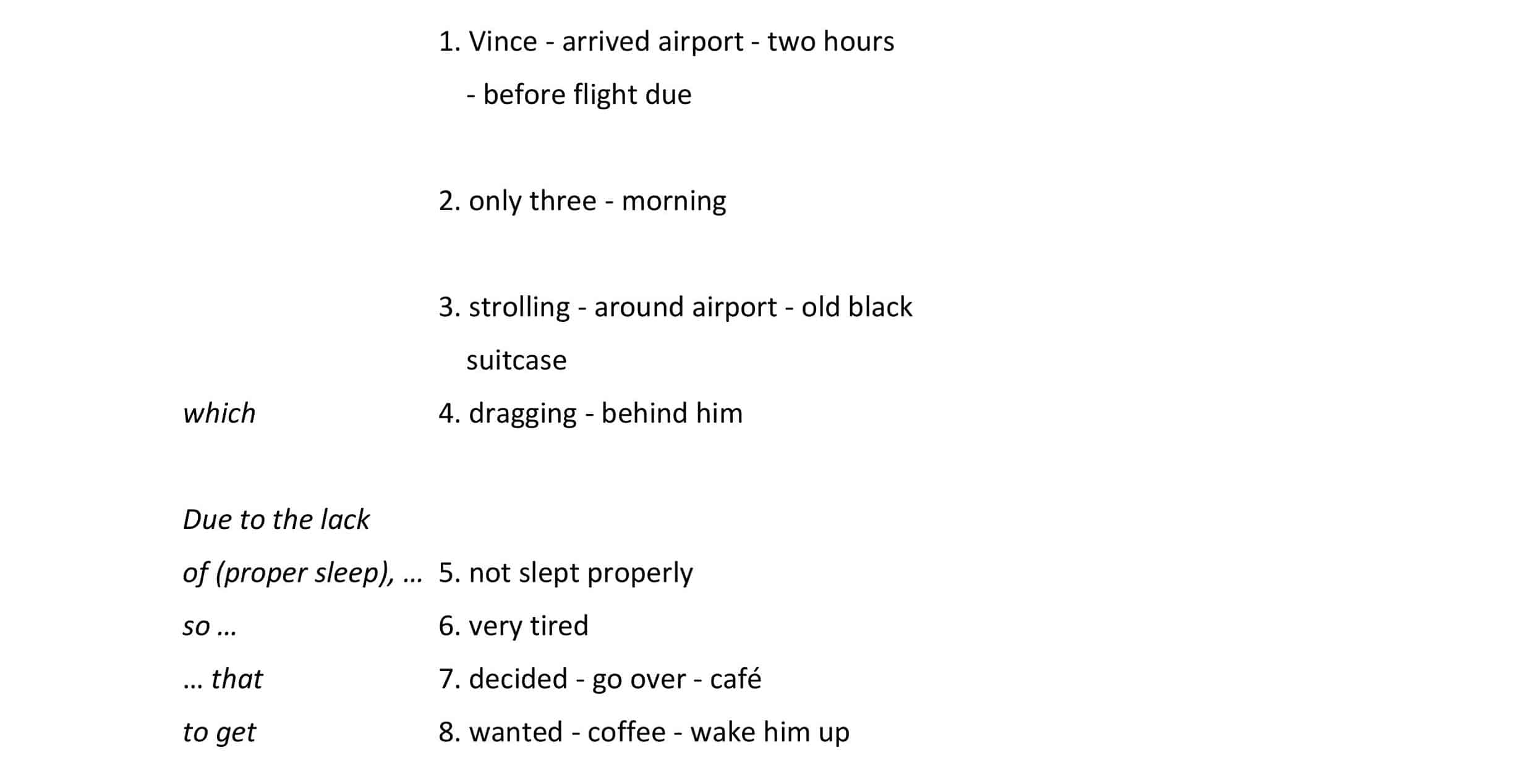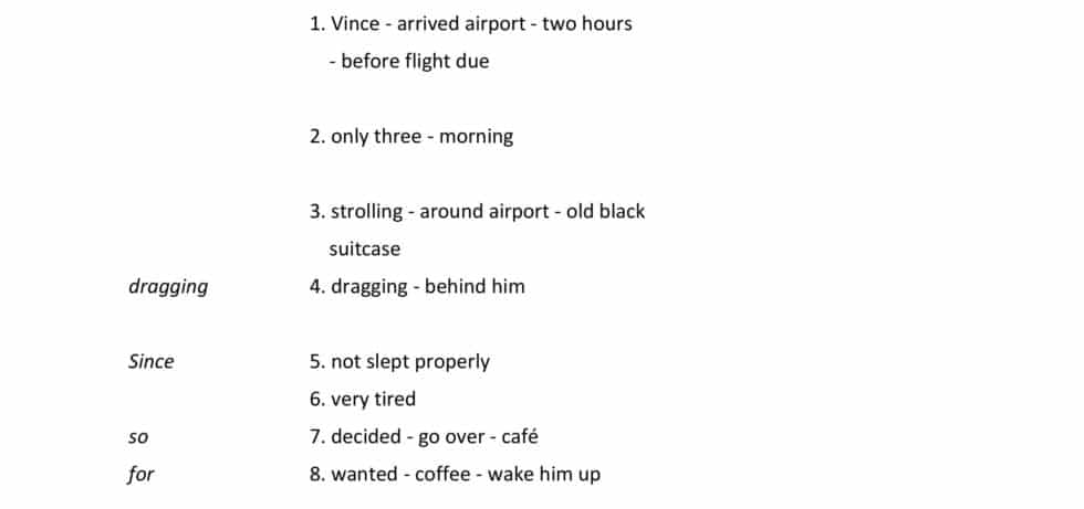 Vince arrived at the airport two hour before his flight was due. He was very tired as it was only 3:00 in the morning. He was strolling around the airport with his old black suitcase dragging behind him. He hadn’t slept properly, so he decided to go over to a café for some coffee to wake him up.