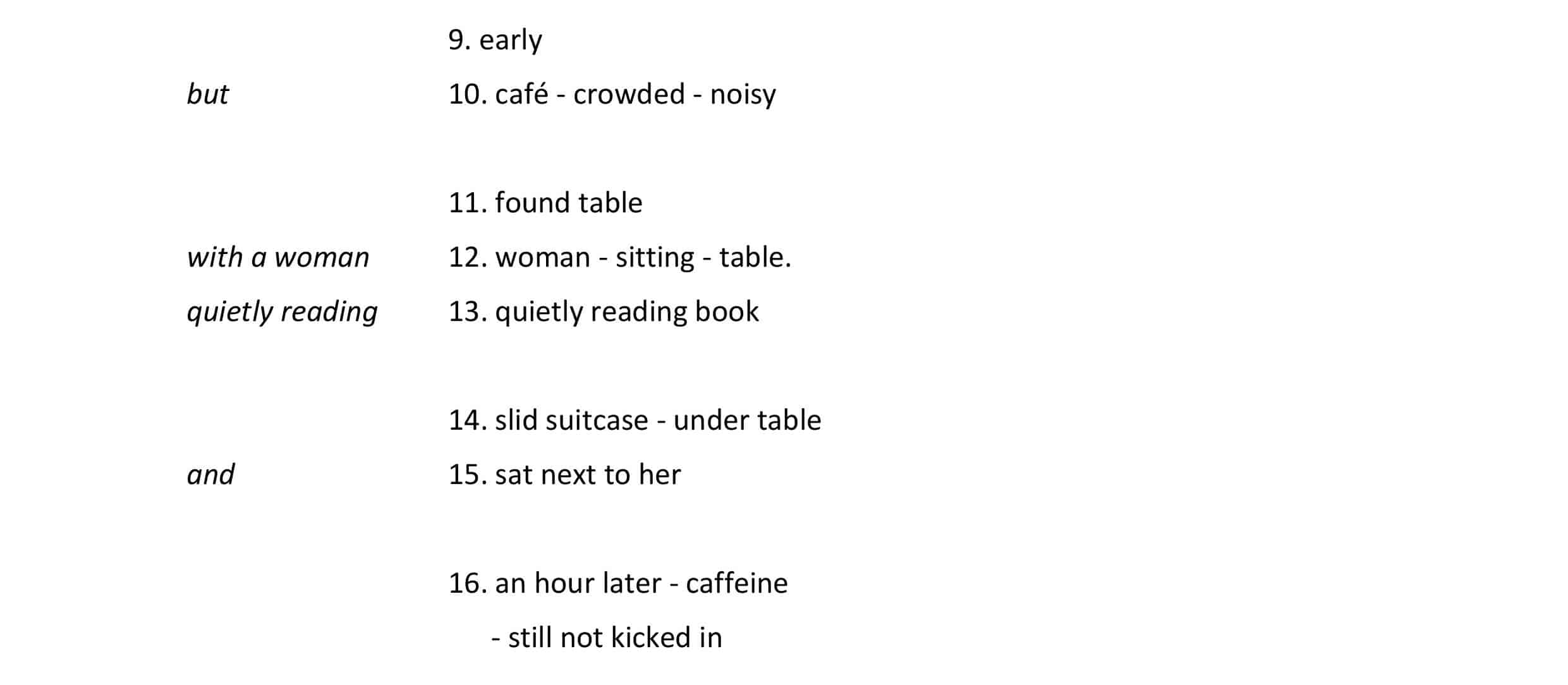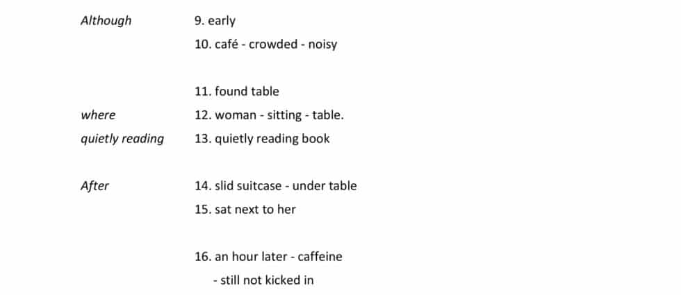 It was early, but the café was crowded and noisy. He found a table with a woman sitting at it, quietly reading a book. He slid his suitcase under the table and sat next to her.