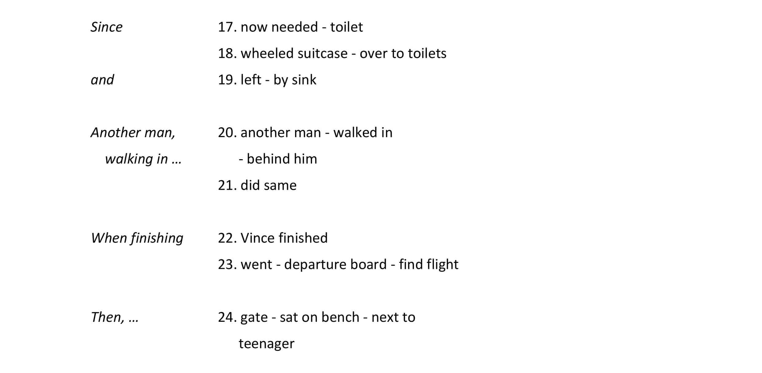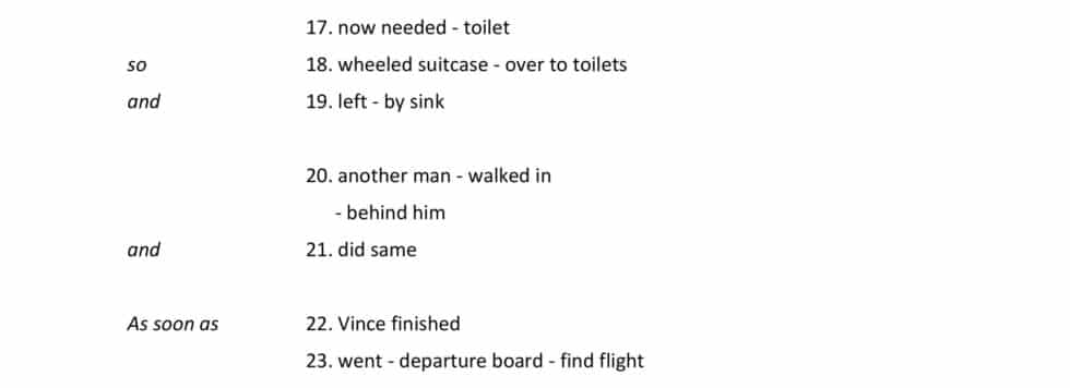 An hour later, the caffeine still hadn’t kicked in. He now needed the toilet, so he wheeled his suitcase over to the toilets and left it by the sink. Another man walked in behind him and did the same. As soon as Vince had finished, he went to the departure board to find his flight.