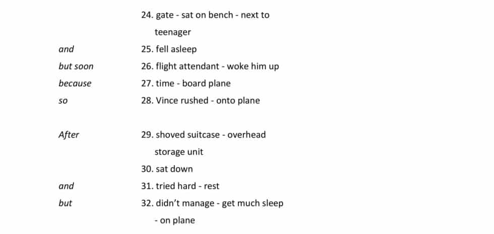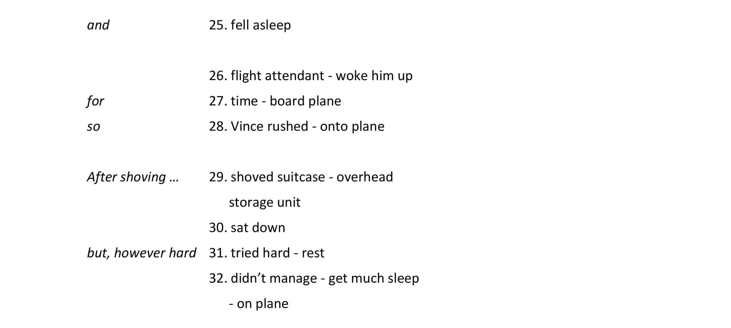 At the gate, he sat on a bench, next to a teenager and fell asleep, but soon a flight attendant woke him up because it was time to board his plane, so Vince rushed onto the plane. After he had shoved his suitcase in the overhead storage unit, he sat down and tried hard to rest but didn’t manage to get much sleep on the plane.