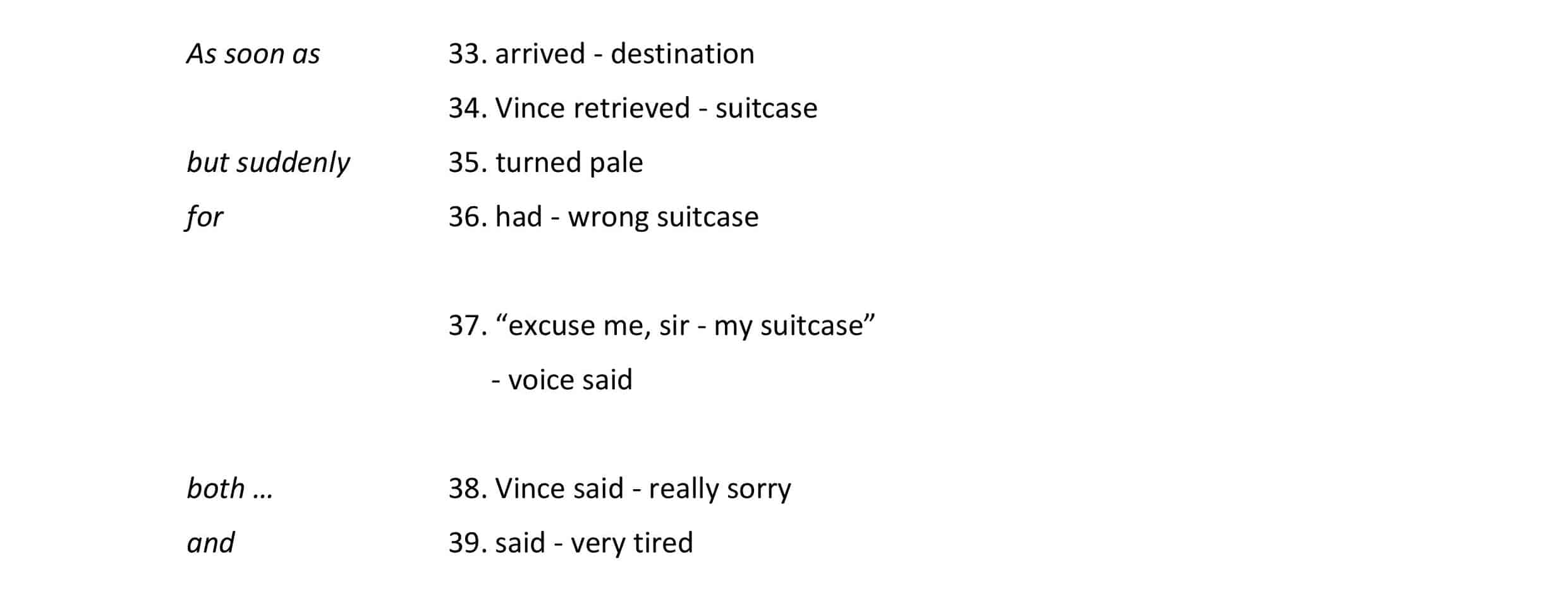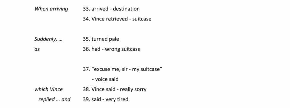 After shoving his suitcase into the overhead storage unit, he sat down, but however hard he tried to rest, he didn’t manage to get much sleep on the plane. As soon as they had arrived at their destination, Vince retrieved his suitcase but suddenly turned pale, for he had the wrong suitcase.