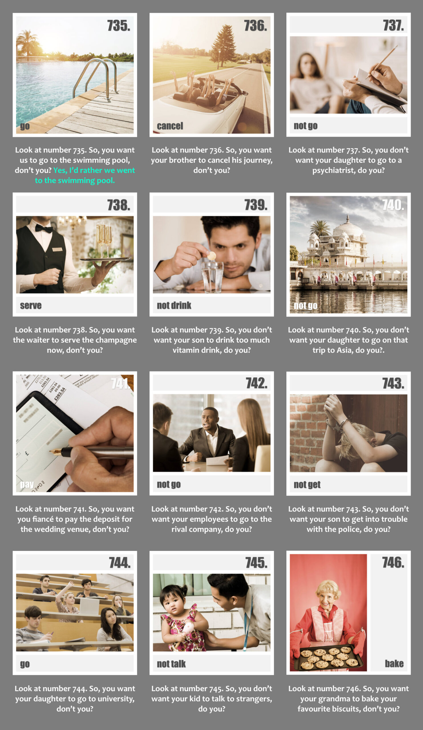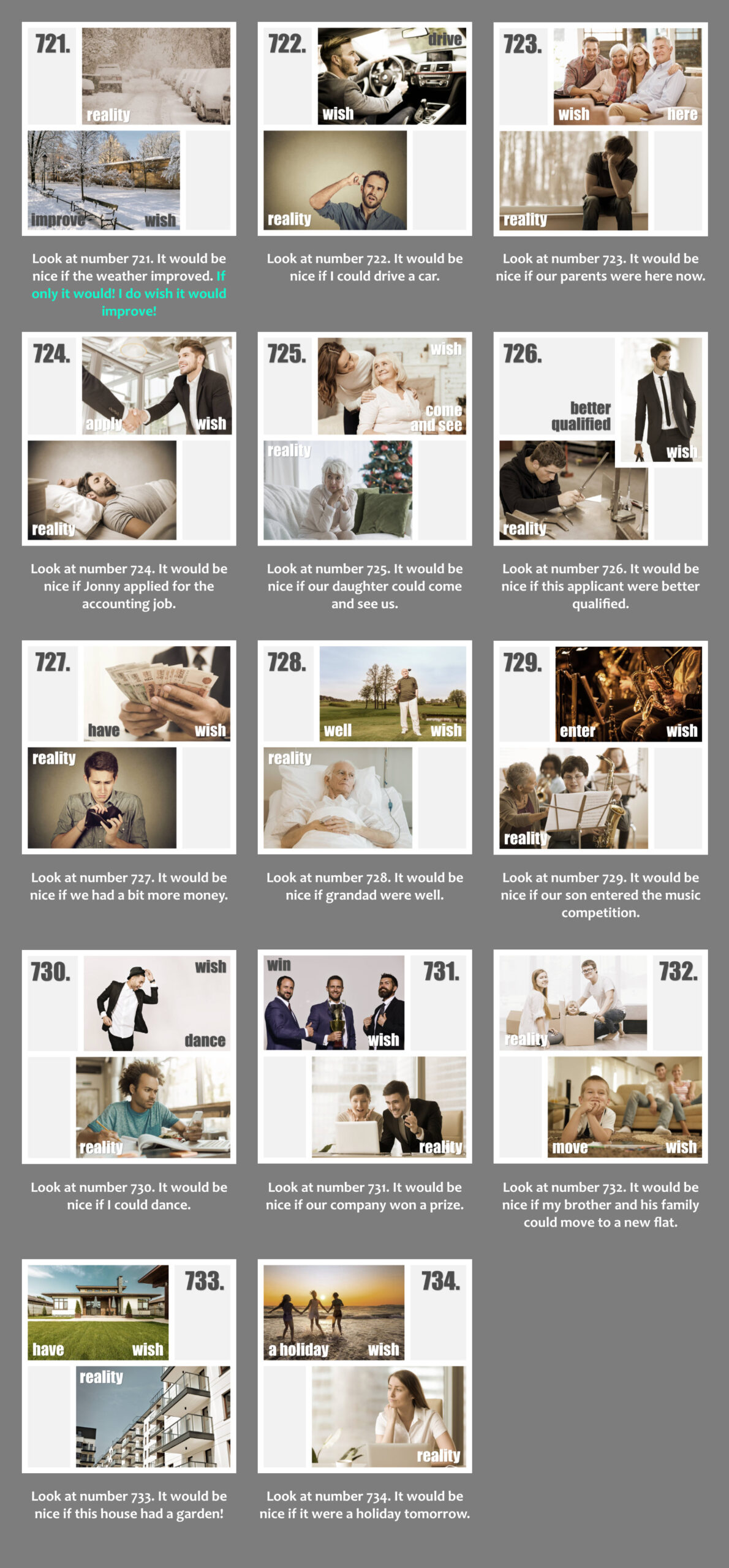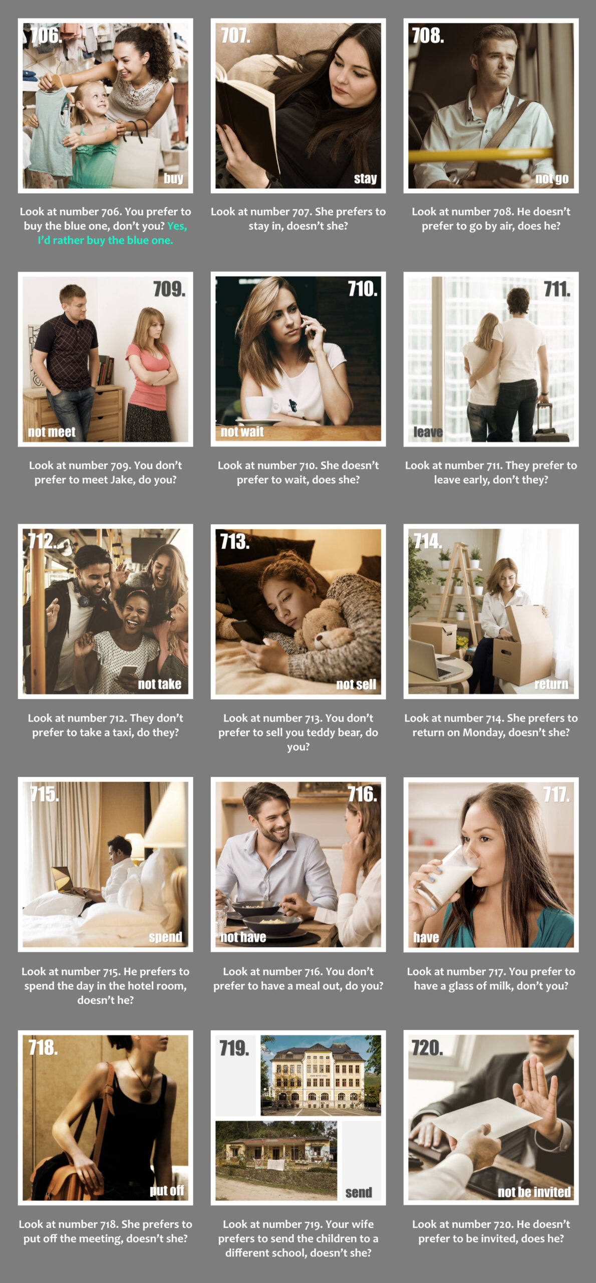 - Nyisd le a gyakorlat kapcsolóját. Látni fogod a gyakorlathoz kapcsolódó képanyagot, valamint a képek alatt a kérdéseket. Az első 2 példa válaszai mintát adnak a választípusra, amit a gyakorlat elvár. Minden képen megtalálod a kulcsszót is, így minden egyes szó leírása tisztázott.