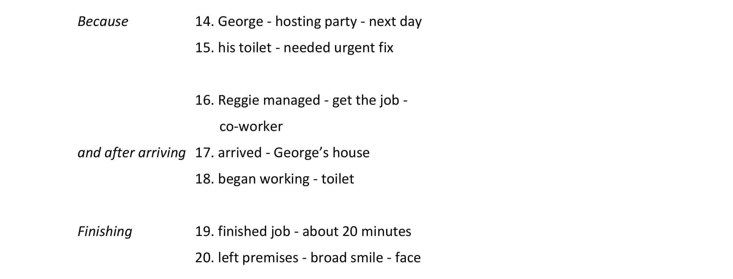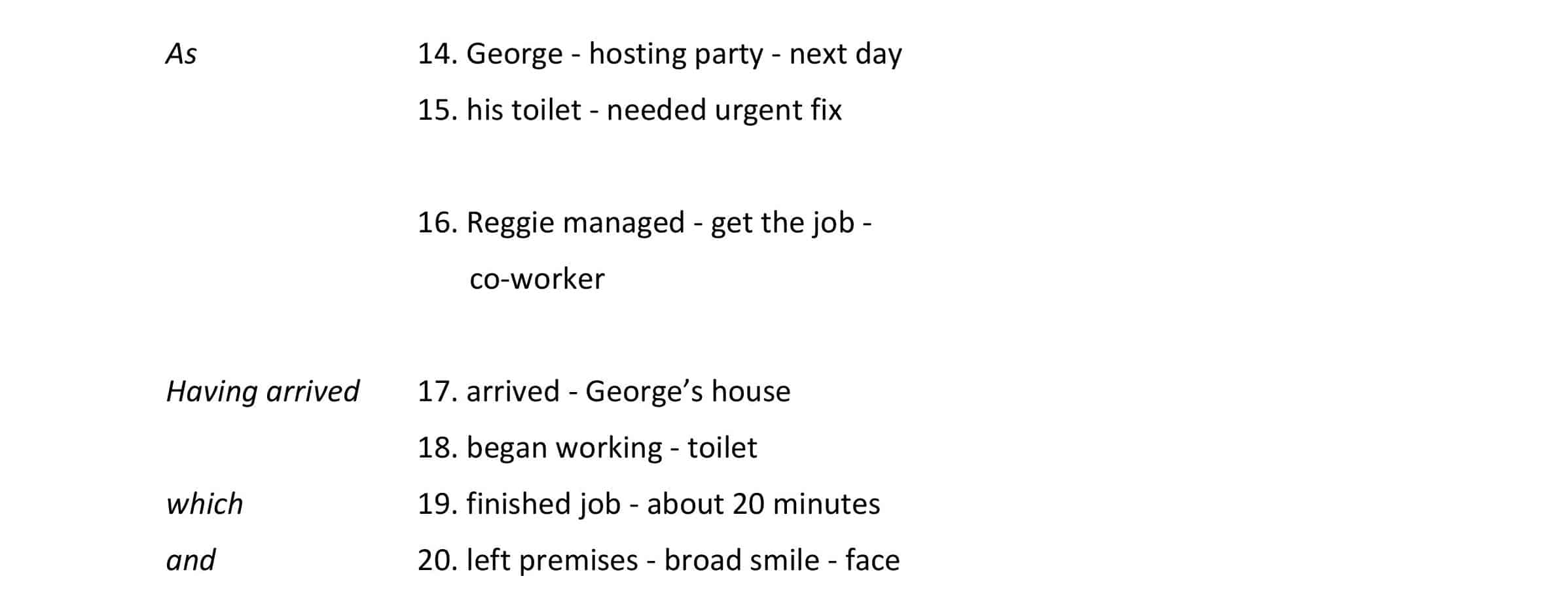 13. overheard – George – book plumber – one of his colleagues – repair toilet – his home