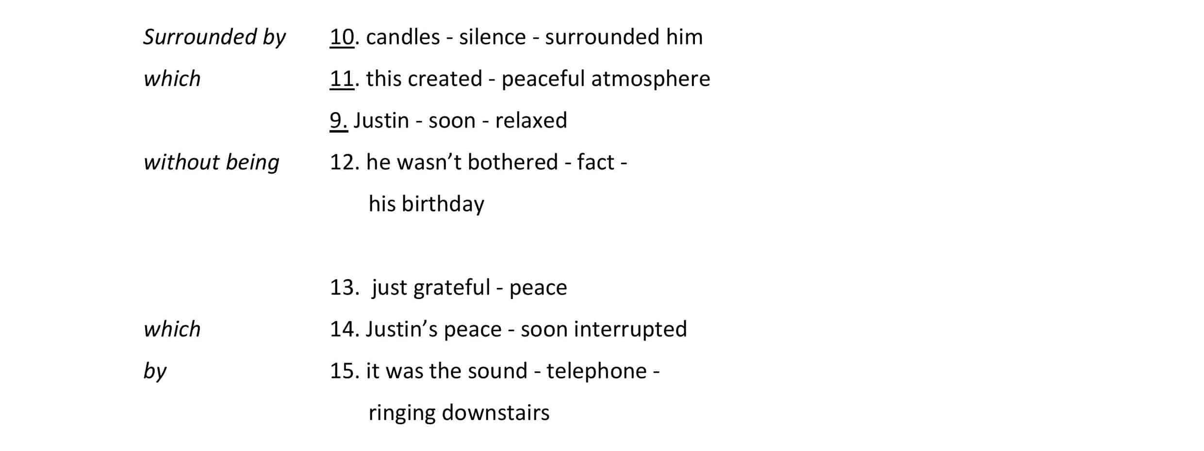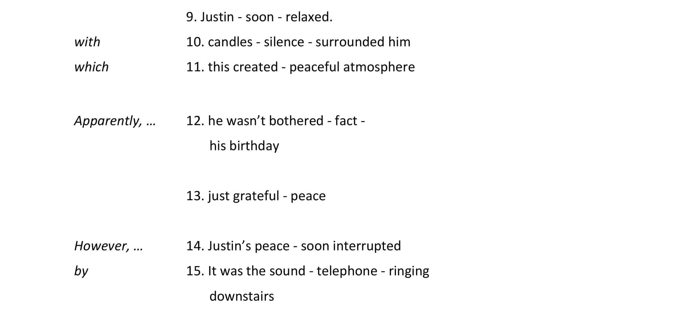 Surrounded by candles and silence, which created a peaceful atmosphere, Justin soon relaxed without being bothered about the fact that it was his birthday. He was just grateful for the peace which was soon interrupted by the sound of the telephone ringing downstairs.