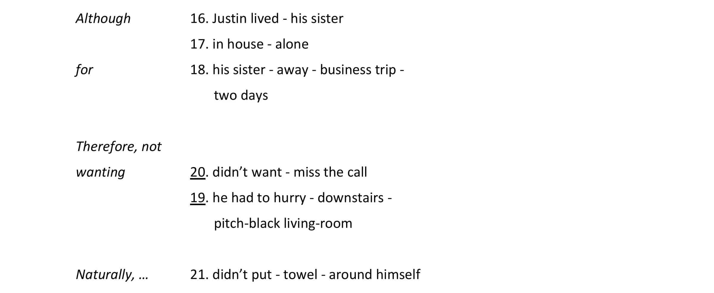 However, Justin’s peace was soon interrupted by the sound of the telephone ringing downstairs. Although Justin lived with his sister, he was in the house alone, for his sister was away on a business trip for two days. Therefore, not wanting to miss the call, he had to hurry downstairs into the pitch-black living room.