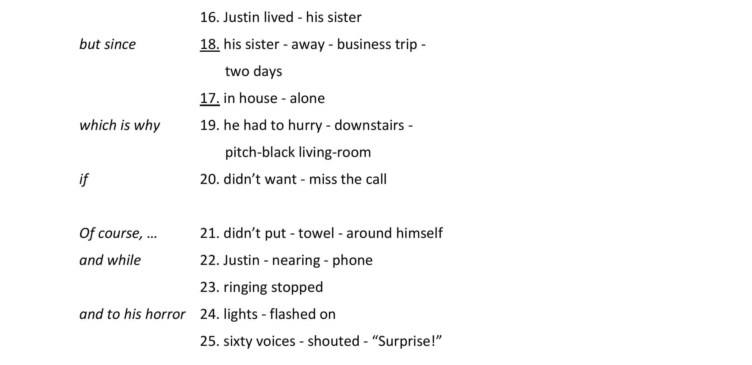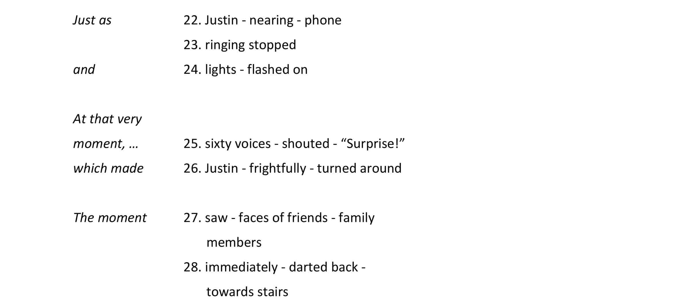 Naturally, he didn’t put a towel around himself. Just as Justin was nearing the phone, the ringing stopped, and the lights flashed on. At that very moment, sixty voices shouted “Surprise!” which made Justin frightfully turn around.