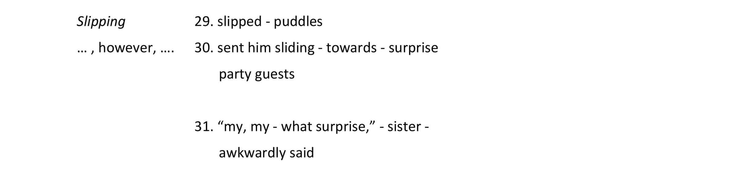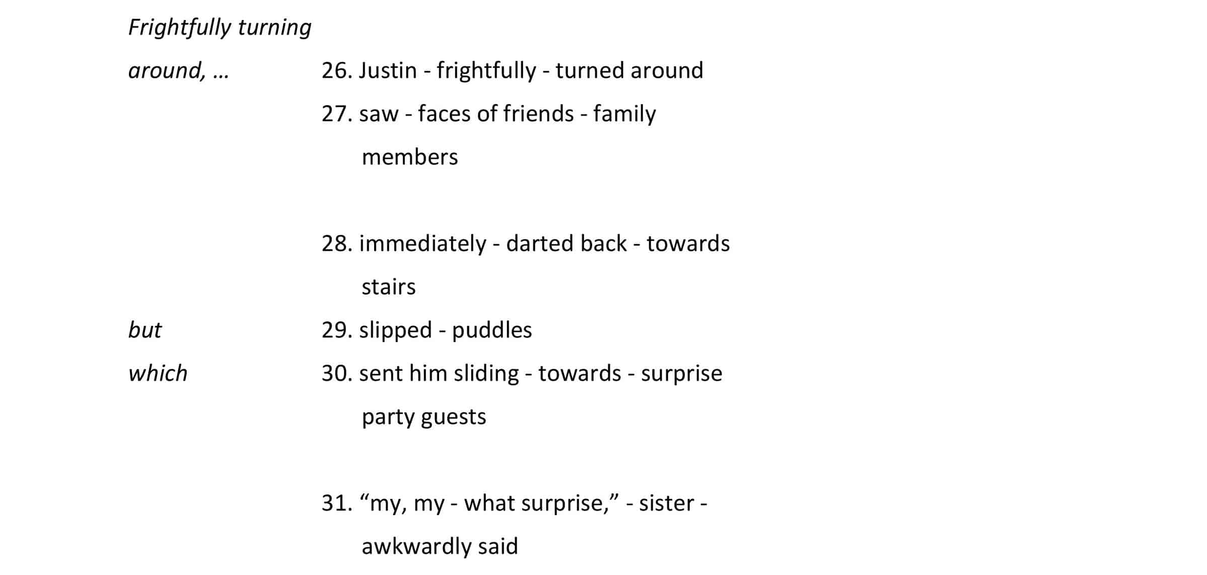 Frightfully turning around, Justin saw the faces of his friends and family members. He immediately darted back towards the stairs but slipped in the puddles, which sent him sliding towards his surprise party guests. “My, my…what a surprise,” his sister awkwardly said.