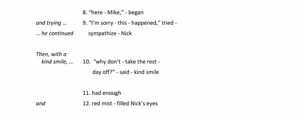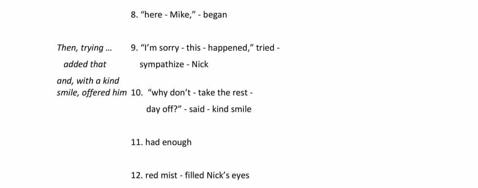 “Here you are Mike. I’m so sorry this has happened. Why don’t you take the rest of the day off?” he said sympathetically. A red mist filled Nick’s eyes. He had had enough.